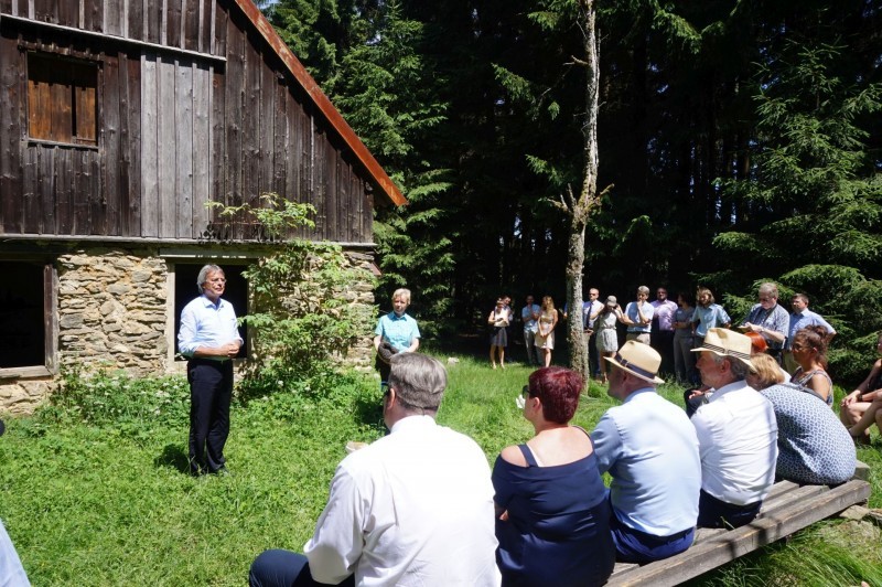 Emotionale Moment erlebte das Partnerforum bei der Exkursion zur Bügellohe in der Mittagspause. Regierungspräsident Axel Bartelt setze mit dem Besuch des letzten noch erhaltenen Anwesens an diesem vom Leid der Vertreibung geprägten Ort vor Hejtman Josef Bernard und einem großen Kreis von bayerischen und tschechischen Konferenzteilnehmern bewusst ein Zeichen der Versöhnung. „Wichtig ist, dass sowas nie wieder passiert“ war die Botschaft der Maria Wachter als letzte Worte in einer gespielten Szene, die alle beeindruckte. „Ich bitte dich darum, lieber Josef, bei einem meiner nächsten Besuche in Pilsen, gemeinsam an einen Ort zu gehen, an dem umgekehrt wie hier Unrecht von Deutschen an Tschechen ausgeübt wurde“ sagte Regierungspräsident Axel Bartelt zum Pilsener Hejtman Bernard, der diesen Wunsch als ehrliche Geste der Versöhnung verstand. Daran anknüpfend griff der höchste Repräsentant der Region Pilsen beim abendlichen Sommerempfang in seinem Grußwort seine persönlichen Erfahrungen mit den unsäglichen Diktaturen von Nationalsozialisten und Kommunisten auf und erzählte über seine Erinnerungen an die Jahre vor 1989, als in ihm, einem unter den Kommunisten leidenden Jugendlichen, Widerstandsgefühle aufkamen, die schließlich in der „Samtenen Revolution“, getragen von Millionen Menschen, vor 30 Jahren zur Wende führten.