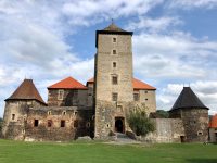 Weiter ging es zum Höhepunkt des Tages und dem Ziel, dem vor allem die jungen Teilnehmerinnen und Teilnehmer entgegen fieberten: der Wasserburg Švihov aus dem 16. Jahrhundert. Teile des Films „Drei Haselnüsse für Aschenbrödel“, einer bekannten deutsch-tschechischen Koproduktion, die wohl ein jeder um die Weihnachtszeit schon gesehen haben dürfte, wurden hier gedreht. Eine Ausstellung, reich bebildert und mit zahlreichen Ausstellungstücken, Kostümen, Kutschen, Einrichtungsgegenständen und Filmsequenzen ließen den Film lebendig werden.