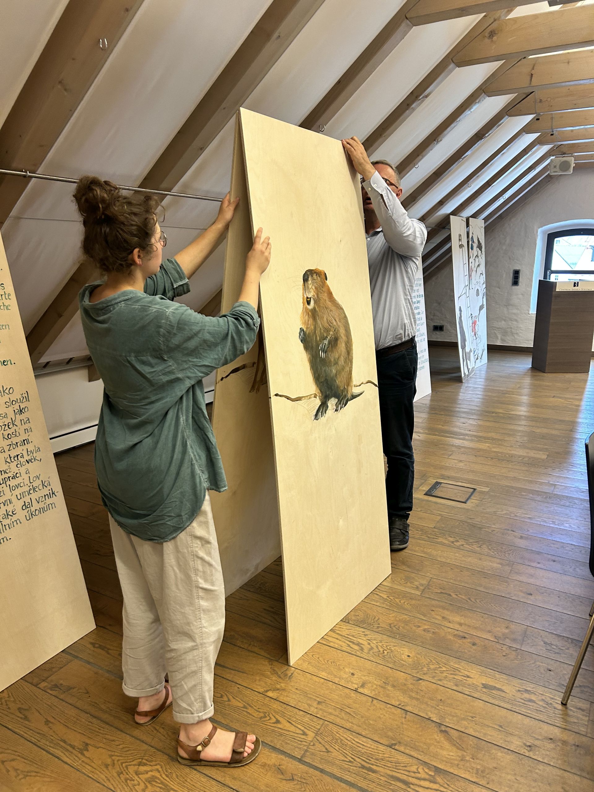 Die junge Künstlerin Iva Ščerbáková malt für die Ausstellung Wildtiere. In der Ausstellung werden die Besucher zunächst dem Wild und seiner Rolle im Ökosystem begegnen. Die handgemalten Bilder tragen zum Charme der handgefertigten und natürlichen Materialien in der Ausstellung bei.