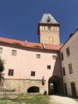 Erneut haben wir Glück. Ich erreiche Martin. Zwar können wir nicht in seinen kleinen Garten campen, da seine Nachbarin einen verzogenen Hund hat, der sonst die ganze Nacht bellen würde. Allerdings kennt er ganz in der Nähe seines Hauses einen idealen Platz zum Zelten. Wir verabreden uns für 19:30 Uhr am Bahnhof. Somit haben wir den ganzen Nachmittag frei für einen Schlossbesuch. Die neu renovierten Innenräume kann man auch hier nur mit einer Führung besuchen. Diese werden lediglich in tschechischer Sprache angeboten. Wieder ist Fortuna uns hold. Da sonst niemand einen Besuch wünscht, erhalten wir eine exklusive Privatführung auf Englisch. Im Anschluss besuchen wir das integrierte Museum. Unsere Köpfe brummen ein wenig, als wir den Treffpunkt erreichen. Pünktlich um halb 8 ist Martin da. Er entschuldigt sich erneut dafür, dass wir unser Zelt nicht bei ihm aufschlagen können. Für uns kein Problem, sind überhaupt froh einen Platz hier in Vimperk zu haben. Martin führt uns seinen „Hausberg“ hinauf. Oben finden wir eine fast gerade, ideale Stelle, bauen auf. Unsere Nachbarn dort sind friedvolle Schafe. Wir verabreden uns mit Martin um 9:00 für das Frühstück bei ihm.