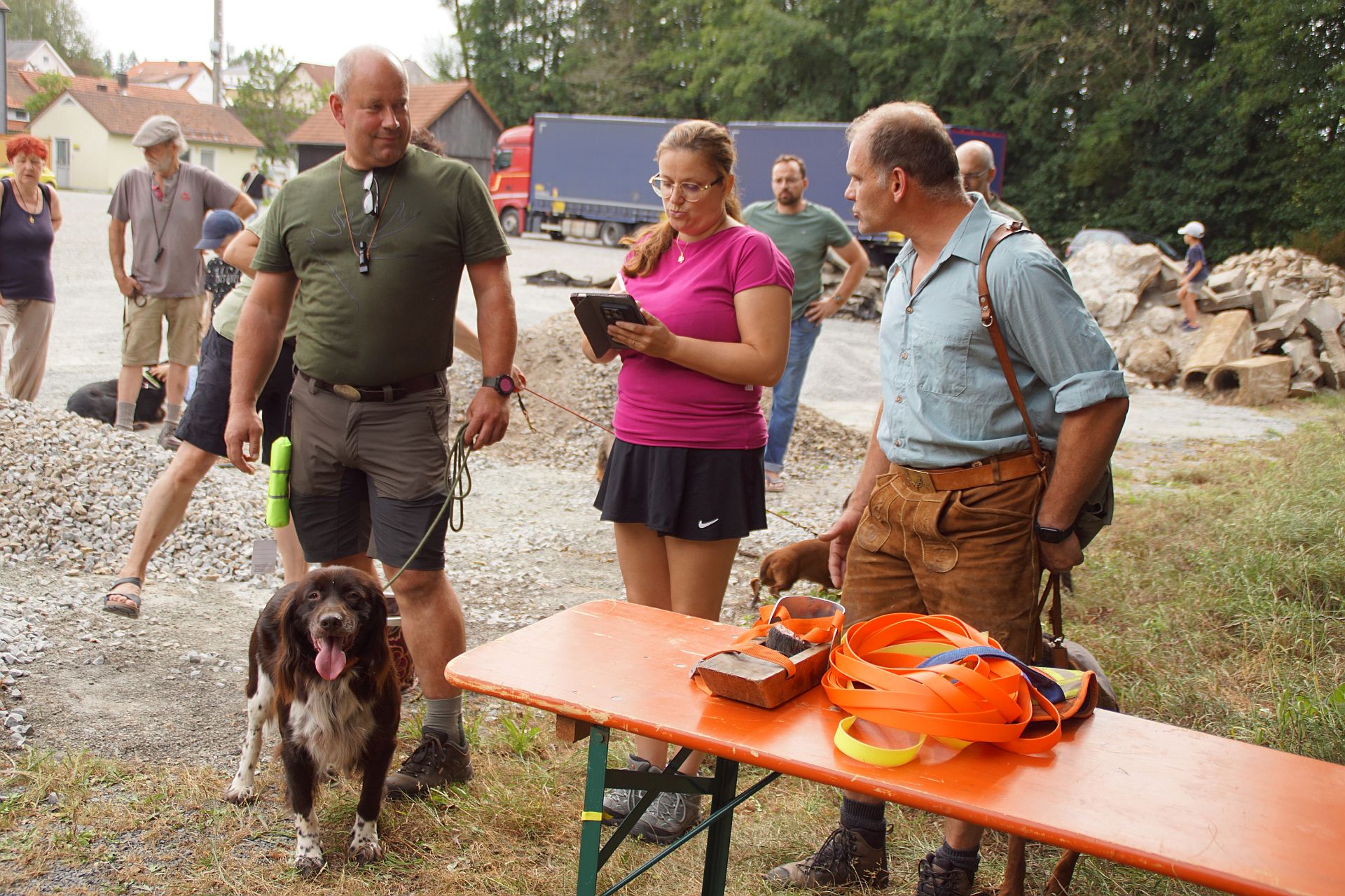“Gustl”, ein kleiner Münsterländer von Marc Liebermann, holte dann bei einer praktischen Vorführung eine solche Übungspuppe aus der neben dem Platz fließenden Ascha. Die Sicherheit für ihre Vierbeiner hat für die Jäger trotz dem erhofften Erfolg beim Jagen Priorität. Bei der Jagd nach Wildschweinen wird den Hunden eine Schutzweste angelegt, die deren wichtigste Körperteile absichert.