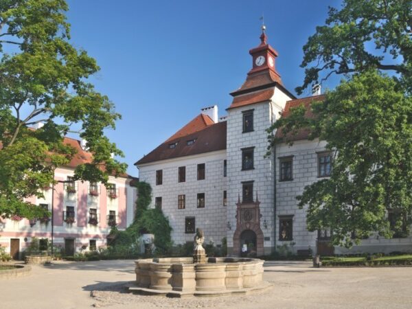 Neodmyslitelnou součástí Třeboně je honosný renesanční zámek, rozkládající se na jihozápadní straně historického centra města. V těchto místech stával nejdříve panský dvorec, změněný na tvrz a později kamenný hrádek, zmiňovaný poprvé roku 1374. Nedlouho předtím koupili Třeboň Rožmberkové, kteří městu a jeho širokému okolí dopřáli náležitý rozvoj. Opevněné město dvakrát obléhali husité, naštěstí neúspěšně.