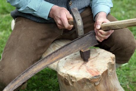 Trénovaní muži, statní Dolnobavoráci, rozkmitají své kosy při veřejné soutěži…