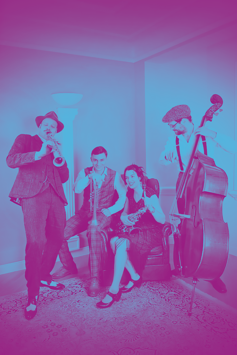 Tři pánové s dámou ve svém programu oživí zlaté časy a oslaví jazzový večírek, který má grády. Čtveřice plnokrevných hudebníků vykouzlí z plstěných klobouků romantické swingové balady i upocené hity v rychlém tempu, které rozvibrují každý taneční parket.