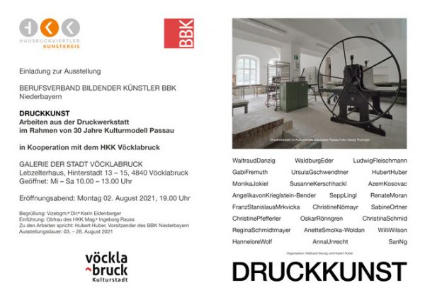 Umělecká díla umělců, kteří v posledních letech vytvářeli umělecká díla různými grafickými technikami v dílně v Kulturmodell Bräugasse v Pasově.