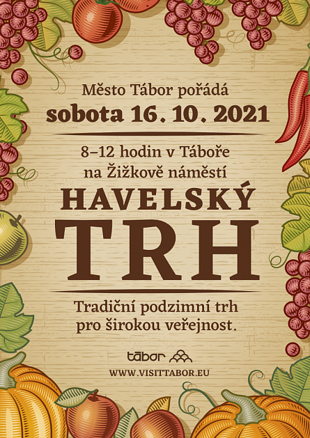 Havelský trh Tradiční podzimní trh na Žižkově náměstí pro širokou veřejnost.Místo konáníŽižkovo Náměstí 14, 390 01 TáborJihočeský kraj, Česká republikaTermín 16.10.2021 08:00 - 12:00 Pořadatel Město Tábor – Žižkovo náměstíMapa Žižkovo Náměstí 14, 390 01 Tábor, Tschechien » Otevřít navigaci