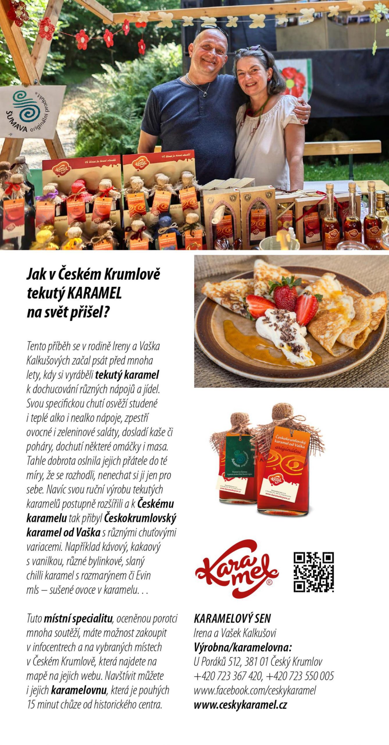 Čeká vás komentovaná prohlídka Karamelovny s ochutnávkou a možností nákupu různých druhů ručně vyráběných tekutých karamelů od čisté karamelové chuti až po bylinkové, kávové, kořeněné, s kakaem i slané chilli (ten má využití nejvíce se saláty, sýry nebo masem).