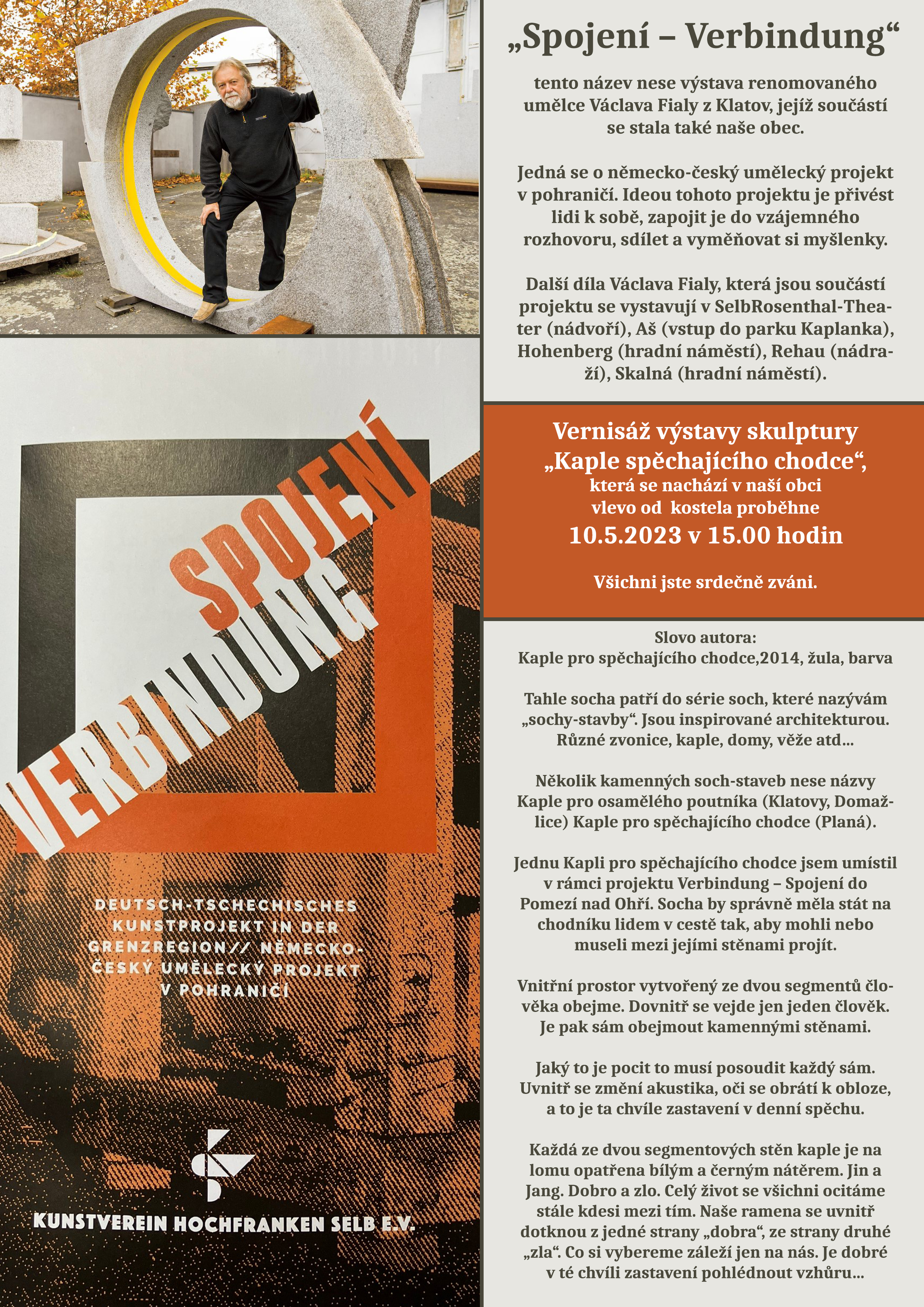 Vernisáž skulptury „Kaple spěchajícího chodce“, která se nachází v obci vlevo od kostela, proběhne 10. 5. 2023 v 15:00 hodin.