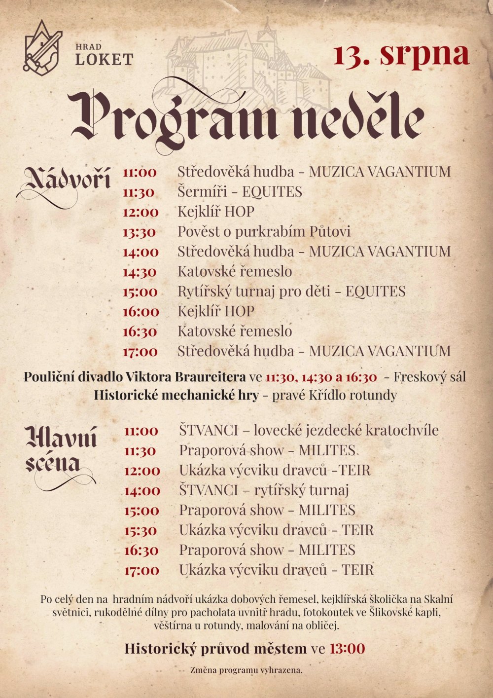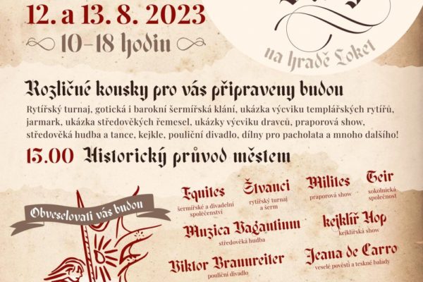 Návštěvníci mohou nasát atmosféru starých časů na hradu Loket, kde mohou hradní branou vstoupit do časů gotiky; přihlížet rytířskému klání, bavit se u divadelních taškařic, obdivovat kejklířské kousky nebo se zaposlouchat do tonů středověké hudby; projít si řemeslný trh, nabrat inspiraci a vyzkoušet si řemesla našich předků.