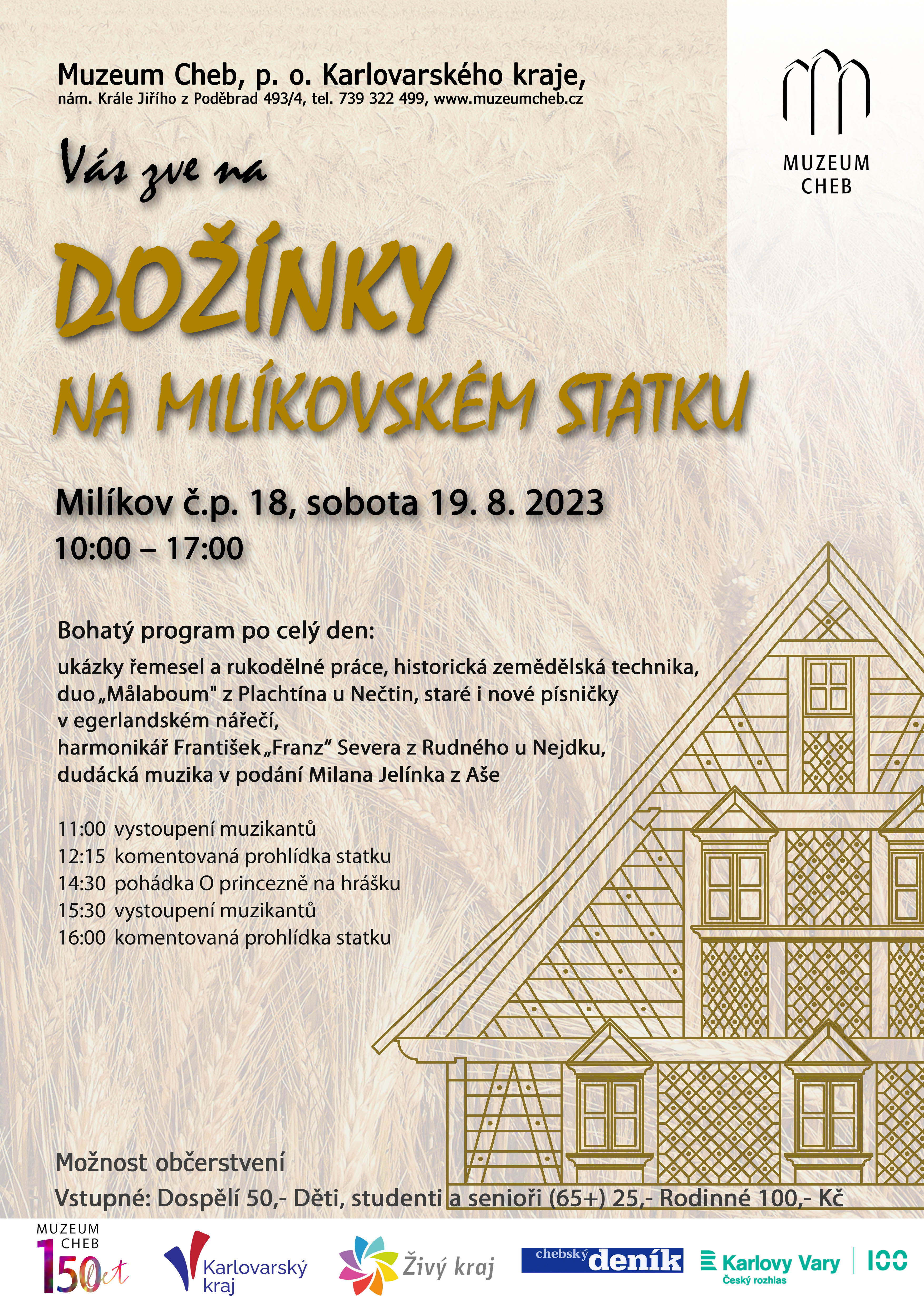 V srpnu nabírají na intenzitě sklizňové práce na polích a v zahradách. Vrcholí sklizeň obilí. Její ukončení se v minulosti neobešlo bez slavnosti dožínek. Této staré tradici letos již podruhé dostojí také Muzeum Cheb. Na sobotu 19. srpna připravují pracovníci muzea akci s názvem Dožínky na milíkovském statku.