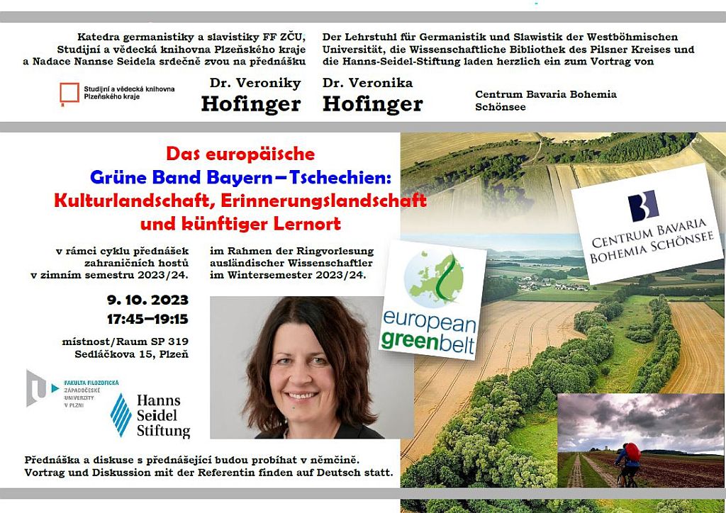 Katedra germanistiky a slavistiky FF ZČU, Studijní a vědecká knihovna Plzeňského kraje a Nadace Hannse Seidela srdečně zvou na přednášku Dr. Veroniky Hofingerové (Centrum Bavaria Bohemia) na téma “Evropský Zelený pás Čechy-Bavorsko: kulturní krajina, památná krajina a budoucí místo vzdělávání” v rámci cyklu přednášek zahraničních hostů v zimním semestru 2023/24.