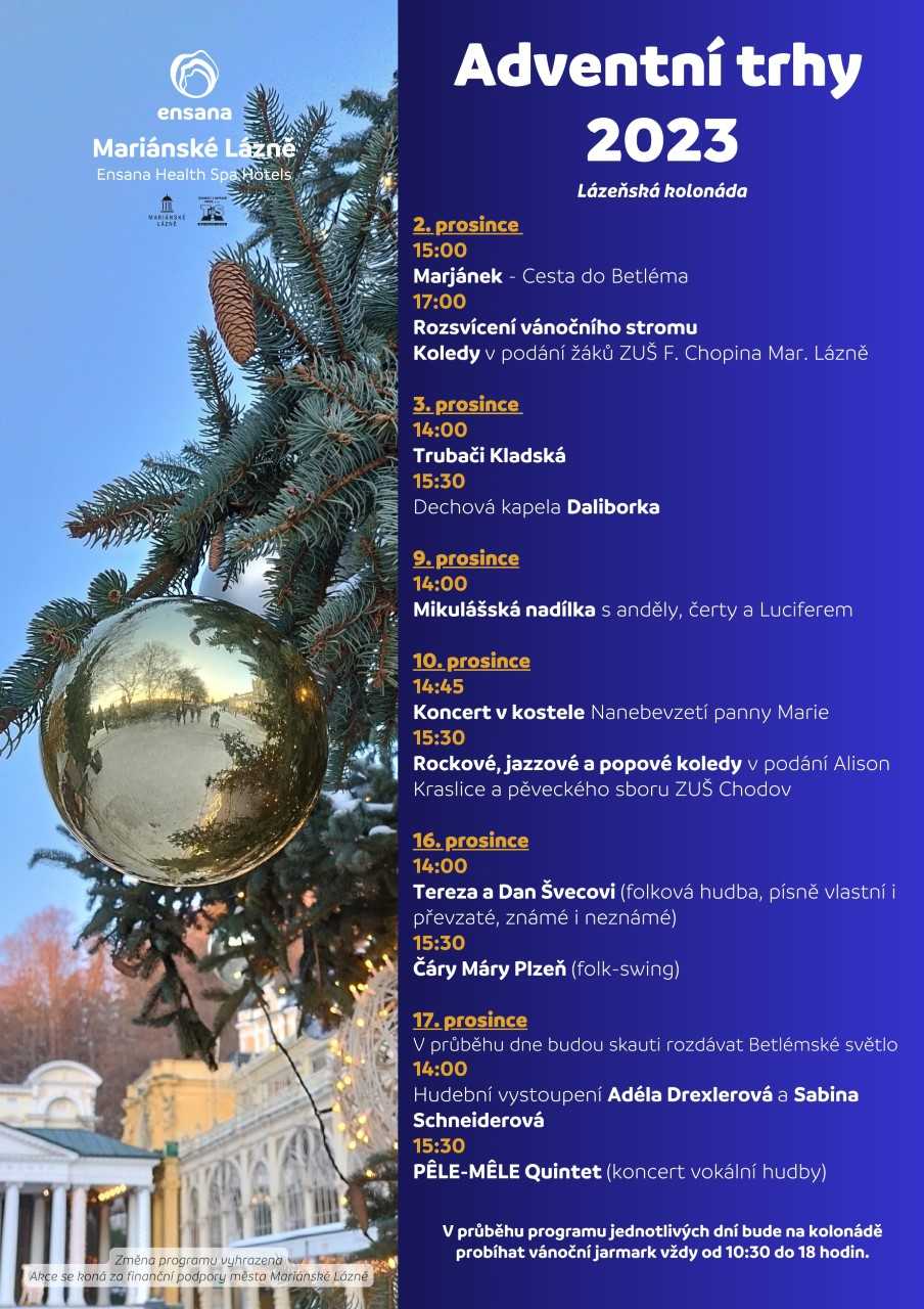 V neděli 10. prosince 2023 od 14:45 proběhne koncert v kostele Nanebevzetí panny Marie a v 15:30 na kolonádě vystoupí hudební skupina Alison a pěveckého sboru ZUŠ Chodov se svými netradičními koledy (rockové, jazzové a popové).