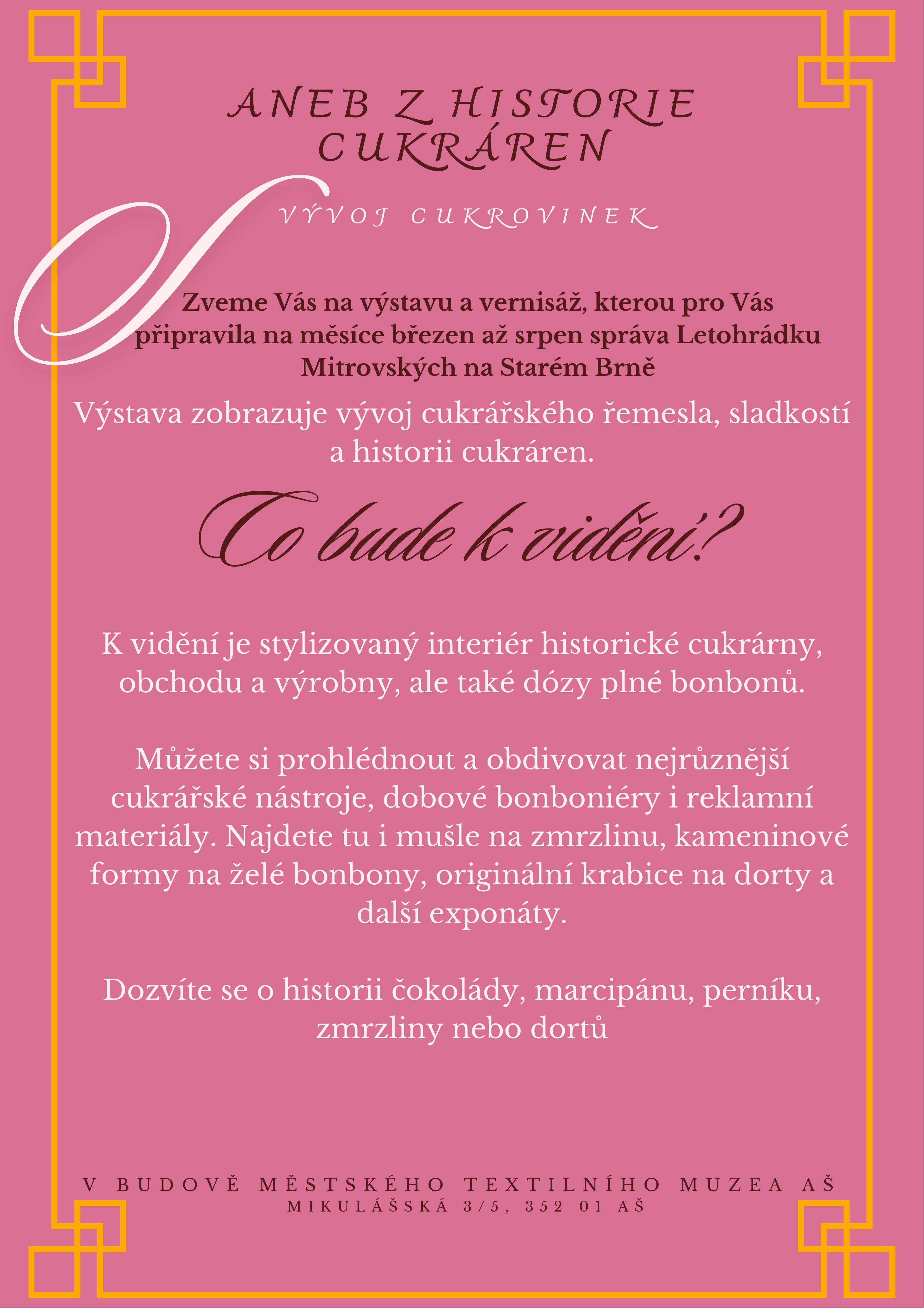 Výstava zobrazuje vývoj cukrářského řemesla, sladkostí a historii cukráren.