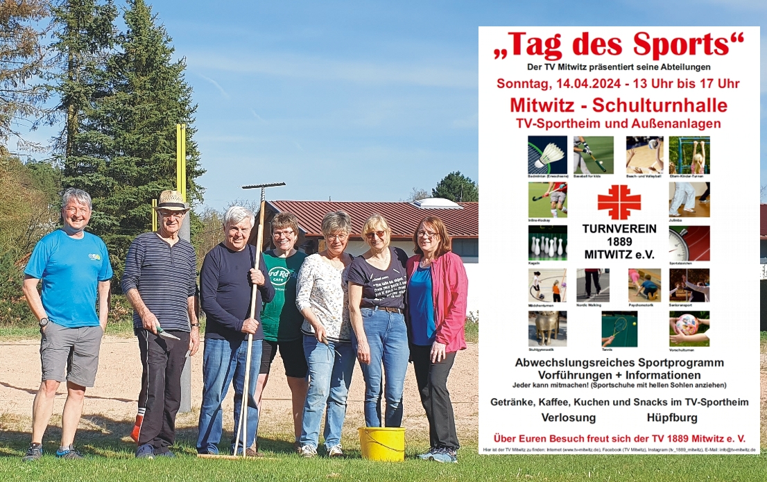Tělocvičný spolek Mitwitz představuje své oddělení na “Sportovním dnu”. Hosté jsou vítáni a zúčastnit se může každý, musí však mít sportovní obuv se světlou podrážkou. Ve sportovním centru TV Mitwitz bude zajištěno pití, káva, zákusky a občerstvení. Hosté se mohou zúčastnit také tomboly a pro děti bude připraven skákací hrad.