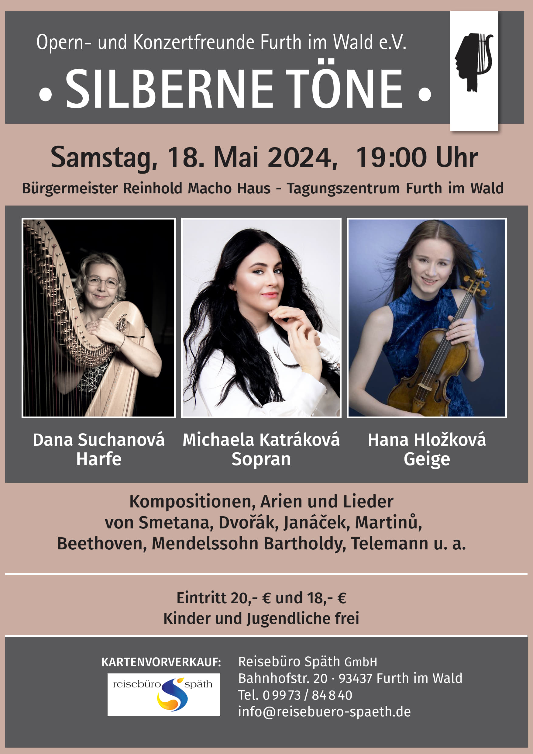 Na tento koncertní večer jsme angažovali vynikající umělkyně: harfistku Danu Suchanovou, houslistku Hanu Hložkovou a sopranistku Michaelu Katrákovou, které vás zavedou do světa ‘Stříbrných tónů.’ Lidský hlas je považován za nejkrásnější hudební nástroj, který je nejblíže houslím. Jsme přesvědčeni, že v kombinaci s harfou, královským nástrojem, to bude zvláštní hudební zážitek!