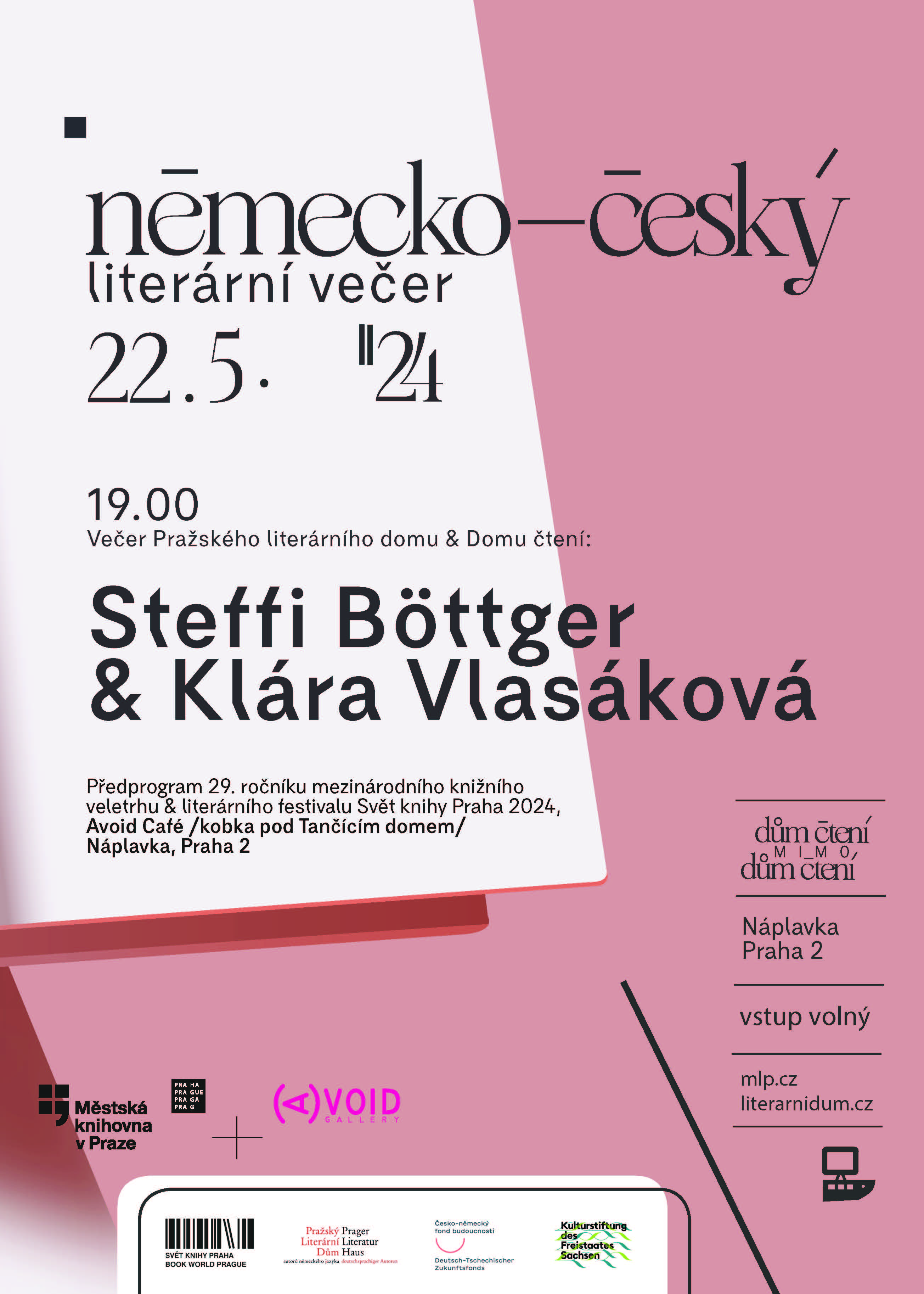 Tradiční česko-německé čtení, které se jako každoročně uskuteční v předvečer zahájení knižního festivalu a veletrhu Svět knihy. Letošními hosty budou naše aktuální stipendistka Steffi Böttger a spisovatelka Klára Vlasáková.