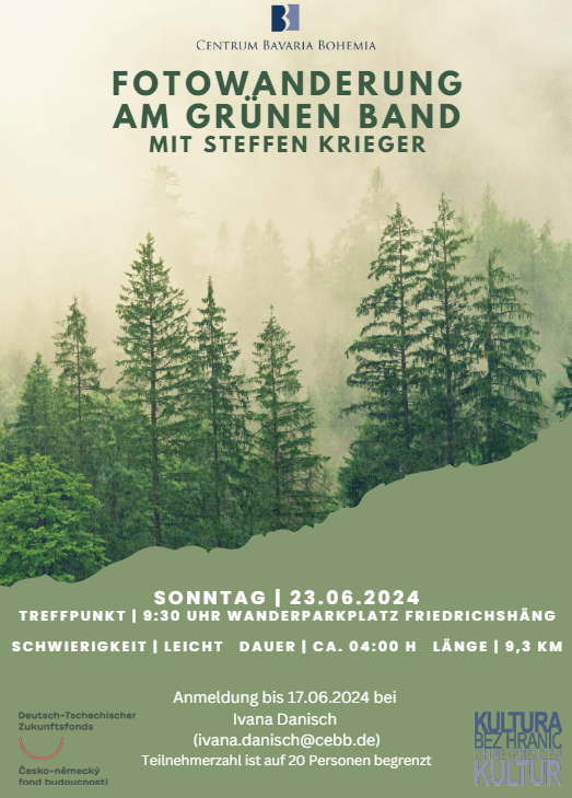 Steffen Krieger žije na okraji Národního parku Bavorský les a již více než 10 let nabízí workshopy fotografování přírody. Sraz účastníků této přeshraniční pěší túry po Česko-bavorském okruhu 2, turistické stezce, je v neděli 23. června v 9:30 hod. na turistickém parkovišti ve Friedrichshäng. Trasa je dlouhá cca 9,3 km, potrvá přibližně 4 hodiny a bude simultánně tlumočena. Doporučujeme pevnou obuv a vhodné oblečení podle počasí. Díky podpoře Česko-německého fondu budoucnosti a okresu Schwandorf je vycházka pro účastníky zdarma a koná se v rámci projektu Kultura bez hranic – Setkání mezi Bavorskem a Českem. Přihlásit se můžete do 17. června u paní Ivany Danisch (ivana.danisch@cebb.de). Počet účastníků je omezen na 20 osob.
