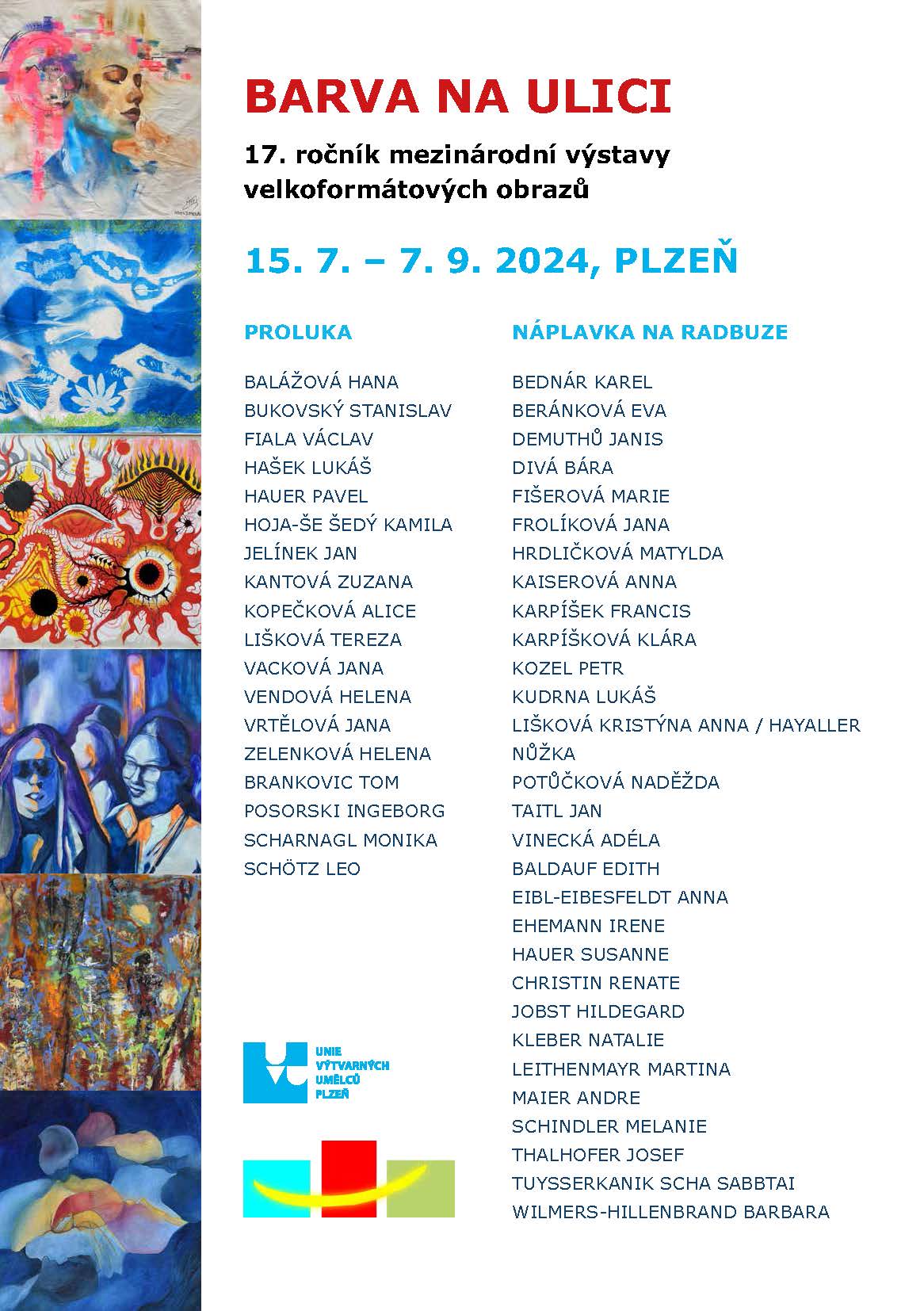 15. července se otevírá v Proluce Křižíkových sadů v Plzni již 17. ročník mezinárodní výstavy velkoformátových pláten BARVA NA ULICI a současně 5. ročník téže výstavy na Náplavce. Na téma Barva hudby tvořili nejen členové UVUP a mladí umělci mimo UVUP, ale i umělci z Weidenu a Regensburgu. Vernisáž výstavy proběhne v pátek 16. srpna v 17 hodin v Proluce Křižíkových sadů jako součást Festivalu na ulici.