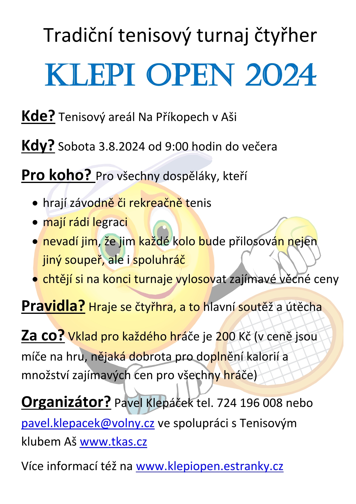 Organizátor je Pavel Klepáček tel. 724 196 008 nebo pavel.klepacek@volny.cz ve spolupráci s Tenisovým klubem Aš (www.tkas.cz)