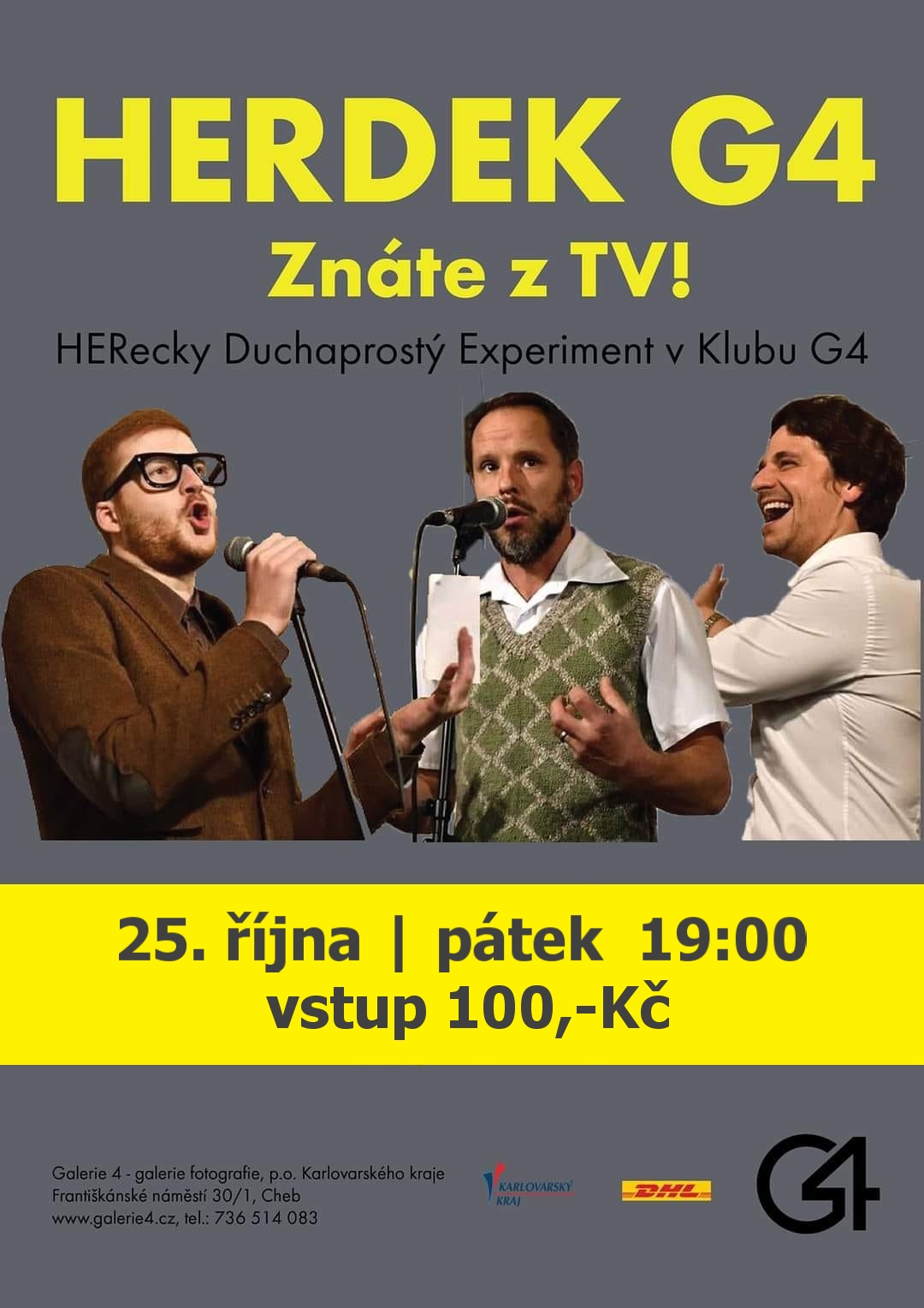 Herdeck G4: Znáte z TV! HERecky Duchaprostý Experiment opět v Klubu G4Improvizační show v podání herců Západočeského divadla v Chebu.Místo konáníFrantiškánské nám. 1, 350 02 ChebKarlovarský kraj, Česká republikaTermín 25.10.2024 19:00 - 21:00 Cena (Kč)100,00 KčPořadatel Galerie 4 – Galerie fotografie, p.o. Karlovarského krajeMapa Františkánské nám. 1, 350 02 Cheb, Tschechien » Otevřít navigaci
