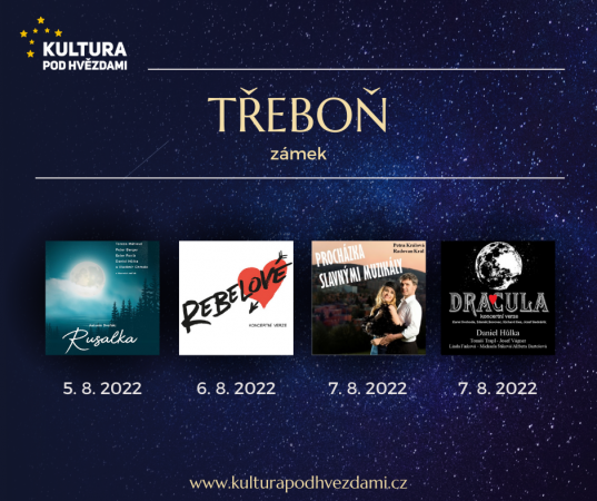 Kultura pod hvězdami pořádá již jedenáctý ročník divadelních představení pod širým nebem. V nádherném prostředí zámku Třeboň můžete zažít krásný a romantický večer s hity filmového retro muzikálu Rebelové z dílny Filipa Renče a Zdeňka Zelenky.