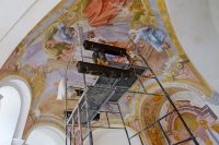 Dostavba východního ambitu někdejšího cisterciáckého poutního místa v Mariánské Týnici na Plzeňsku se kvůli koronaviru protáhne do příštího roku. Nyní se dodělává střecha, zbývá interiér a fasáda. Pod rukama malíře vznikají rozměrné fresky.