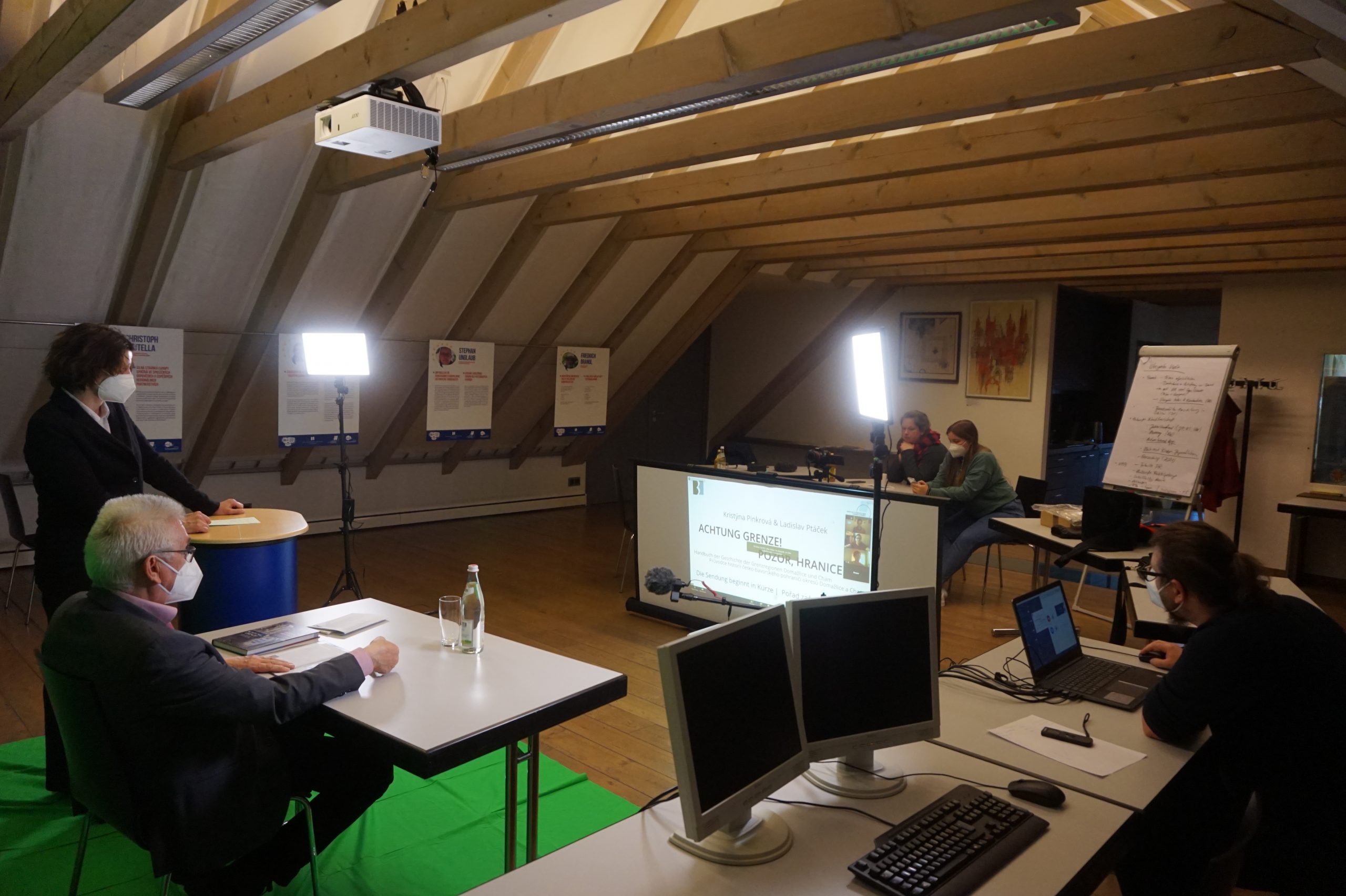 Jedno kliknutí doma na počítači a hned se otevře dvojjazyčné virtuální studio. Organizačně technicky se online formáty během času stávají pro tým CeBB s vedoucí Veronikou Hofinger, šéfem portálu bbkult.net Davidem Verešem a koordinátorkou Ivanou Danisch rutinou. Přesto je to pro studiového hosta v CeBB, spoluautora knihy a prezentujícího na bavorské straně země neznámá, když při představování knihy nemůže hledět do očí publika, nýbrž má před sebou jen kameru. Živě je připojena v Domažlicích historička a vydavatelka Kristýna Pinkrová, která po úvodních slovech Veroniky Hofinger představila výstavní a knižní projekt a v následujícím čtení jedné kapitoly knihy se vystřídala