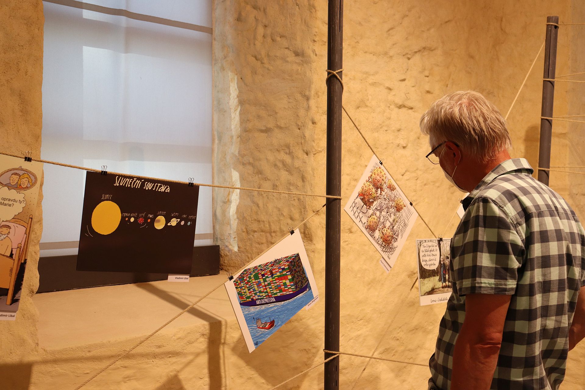 Impulz pro letní výstavu 2021 pod titulem “Corona | Korona. Pandemie v karikaturách” v Centru Bavaria Bohemia (CeBB) dal plzeňský umělec a nositel ceny Stavitel mostů Vladimír Líbal, který své karikatury kreslí nejdřív černobíle tužkou a poté je digitálně koloruje. “Byla to již zatraceně dlouhá doba, kterou jsem musel protrpět sám, bez osobních kontaktů, v mém domě v mé vesnici u Plzně. Někdy mě po dobu dvou týdnů nenapadlo nic, co bych mohl dát na papír, pak zase byly dny, kdy to ze mě přímo vychrlilo a vznikly kresby, které kousavě komentují pandemii. Skutečnost, že některé opravdu trefily nerv publika, se ukázalo na lajcích a pozitivních komentářích na mé facebookové stránce, přes kterou zveřejňuji své kresby.”
