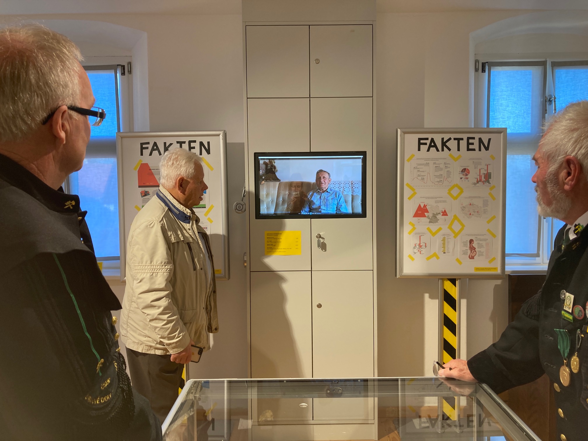 Vedoucí muzea Roland Weis byl zvlášť potěšen, že může přivítat bývalé horníky. Z obou “zkoumaných dolů” u Poppenreuthu a Mähringu zbyla již jen hrstka bývalých horníků, kteří pracovali v podzemí. Větší byla delegace z dřívějších uranových dolů západních Čech. Asi dvacet bývalých horníků dolů Zadní Chodov a Dyleň se v Mähringu objevilo ve svých parádní v uniformách. Starosta Franz Schöner poděkoval Rolandovi a Bettině Weisovým jakož i jejich spolubojovníkům z muzea v Mähringu za přípravu a vydařenou výstavu. V celé budově muzea jsou do poloviny příštího roku k vidění mnohé dokumenty a objekty z období těžby uranu: Od Geigerova počítače a vrtacích kladiv přes stavební plán těžební věže Poppenreuth až po originální koš, v kterém horníci v Mähringu sjížděli do dolu. Půjčovateli byli vedle bývalých horníků Hornické muzeum Planá jakož i Ferdinand Wagner z Muzea minerálií Mähring, který dal také podnět k uvedené výstavě. Od něj pochází navíc četné fotografie uranové rudy, které byly pořízeny speciální technikou pod mikroskopem.