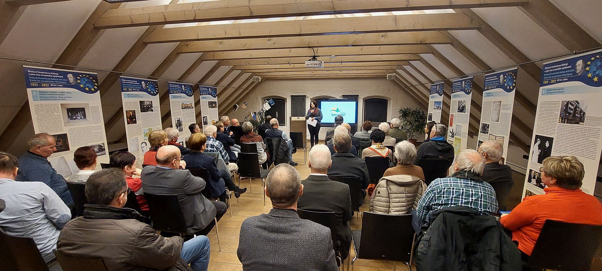 Vedoucí CeBB Dr. Veronika Hofinger se těšila ze zaplněného domu při otevření dvou výstav velkých Evropanů. Blízkost sídla hraběte Richarda Coudenhove-Kalergi, který před 100 lety s manifestem Pan-Europa představil své ideje politicky sjednocené Evropy, nás zavazuje nejen k přeshraničně smiřujícím tématům, jimž se tato instituce věnuje od svého otevření. Ona blízkost souvisí také s tím, že domovské město hraběte Poběžovice (Ronsperg) je od roku 1998 spojeno partnerstvím s Schönsee, Stadlern a Weidingem. Martin Kopecký, starosta partnerského města, projevuje ve svém pozdravném proslovu hrdost na velkého syna města. Má naději, že v zámku vznikne důstojné místo památky na hraběte Richarda Coudenhove-Kalergi.