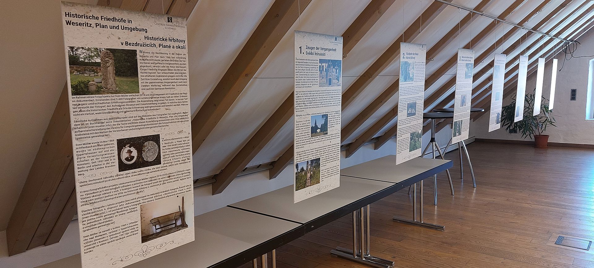 Vměstnat tři fotografické výstavy do jedné je nejen prostorovou, ale i tematickou výzvou. Prezentace odráží protiklady mezi detailním pohledem na člověka ve městě na výstavě Svazu spisovatelů východního Bavorska (VS) a západních Čech a na dalších dvou, které se zaměřují na osamělou krásu starých stromů na židovských hřbitovech v Čechách a hřbitovní klid zesnulých. “Tato neobvyklá kombinace nám připadala docela vzrušující,” říká v úvodu ředitelka CeBB Veronika Hofingerová. “Ano, opravdu zdařilá symbióza,” říká návštěvnice, kterou docela zaujal Sven Müller, jenž v závěrečném bodě v místnosti bb-dialogu představil své fotografie historických hřbitovů ve Weseritz, Plané a okolí.