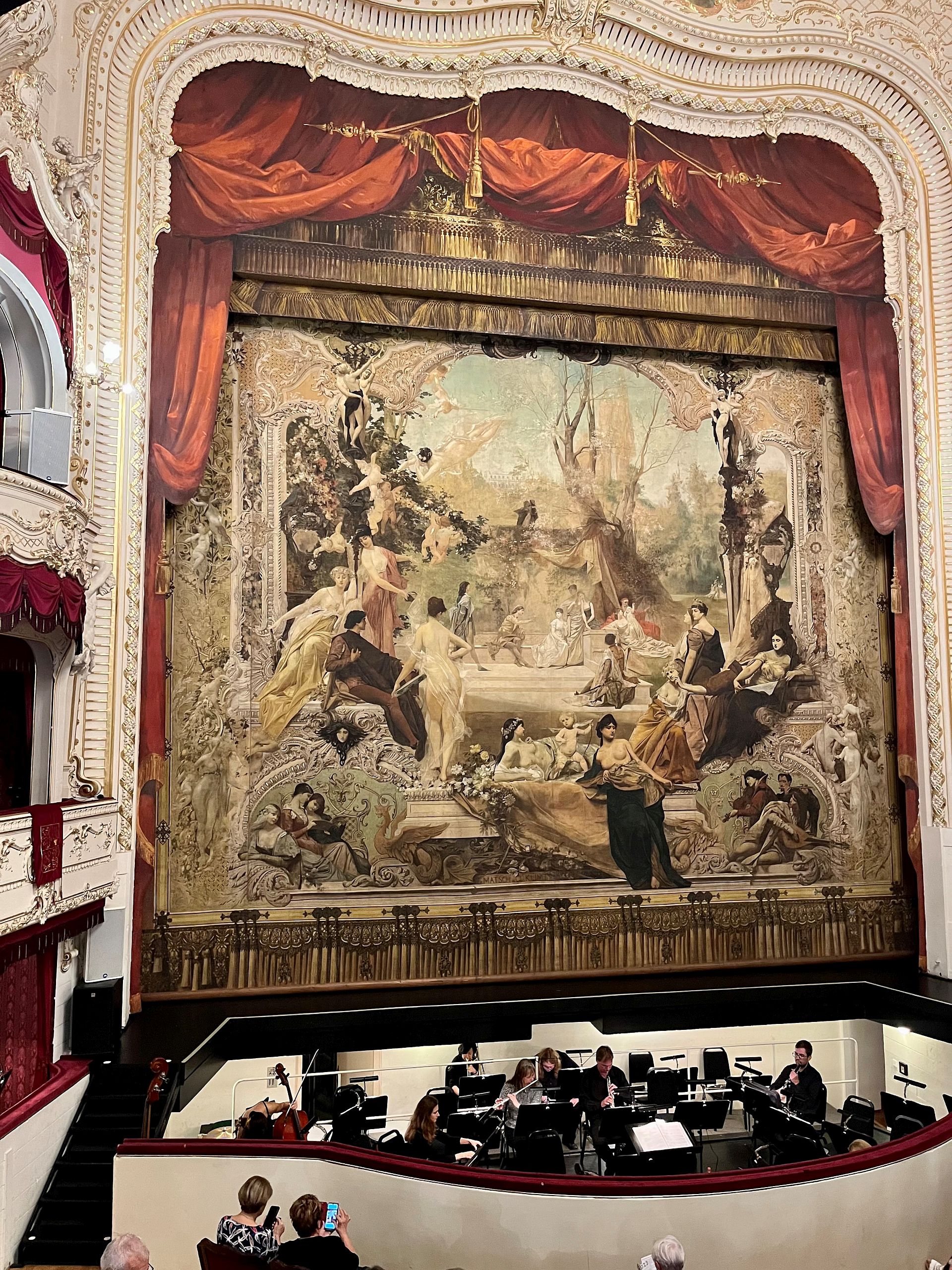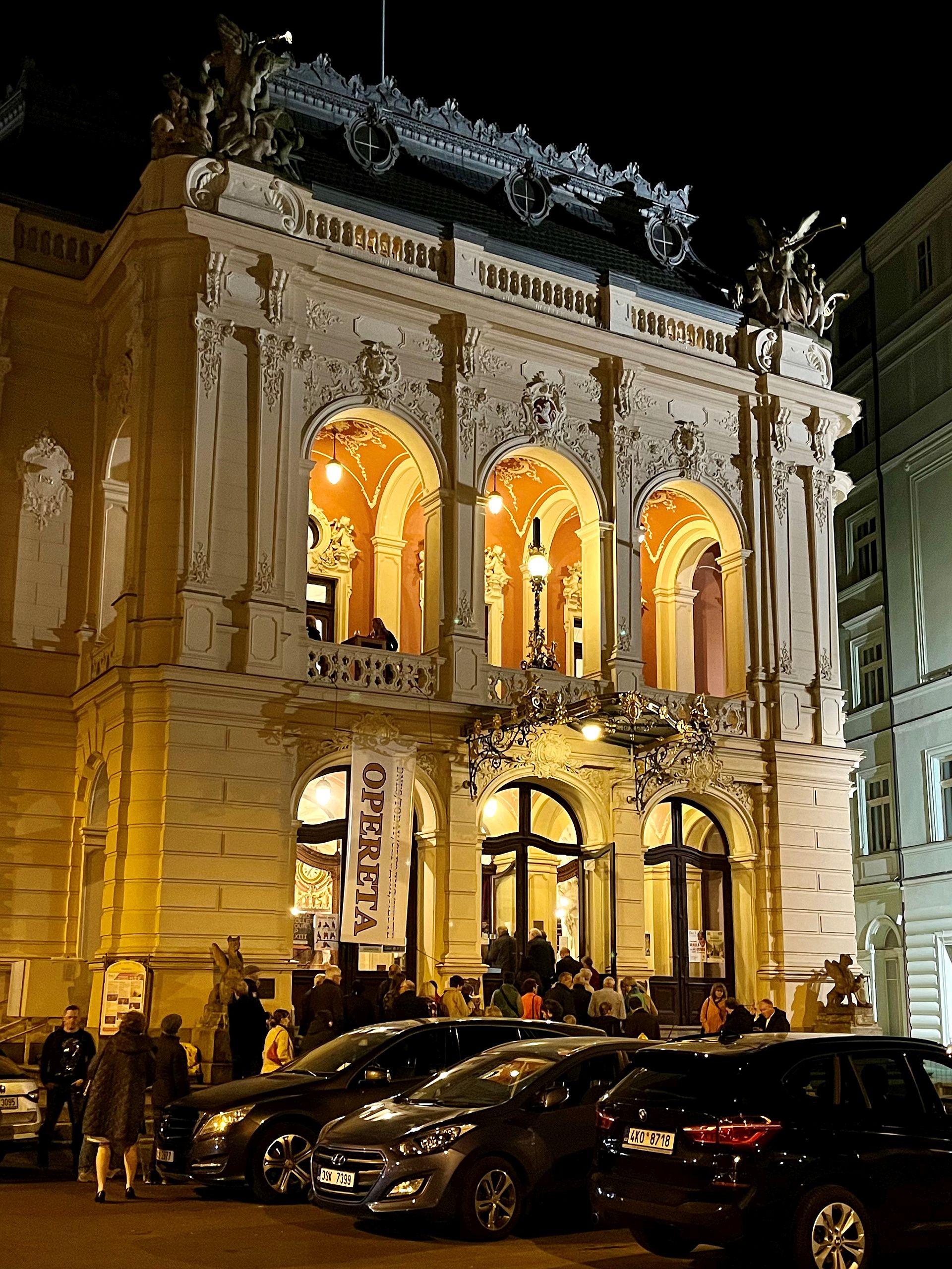 Vrchol večera nás čekal v Městském divadle v Karlových Varech: opereta Franze Lehára “Veselá vdova“. Divadlo, v němž dirigoval již Gustav Mahler, bylo postaveno v letech 1884-1886. Pozoruhodné je celé hlediště a tam zejména jevištní opona. Na oponě pracoval nejslavnější představitel vídeňské secese Gustav Klimt, který na ní ztvárnil sám sebe jako flétnistu. Divadlo má 475 míst k sezení.