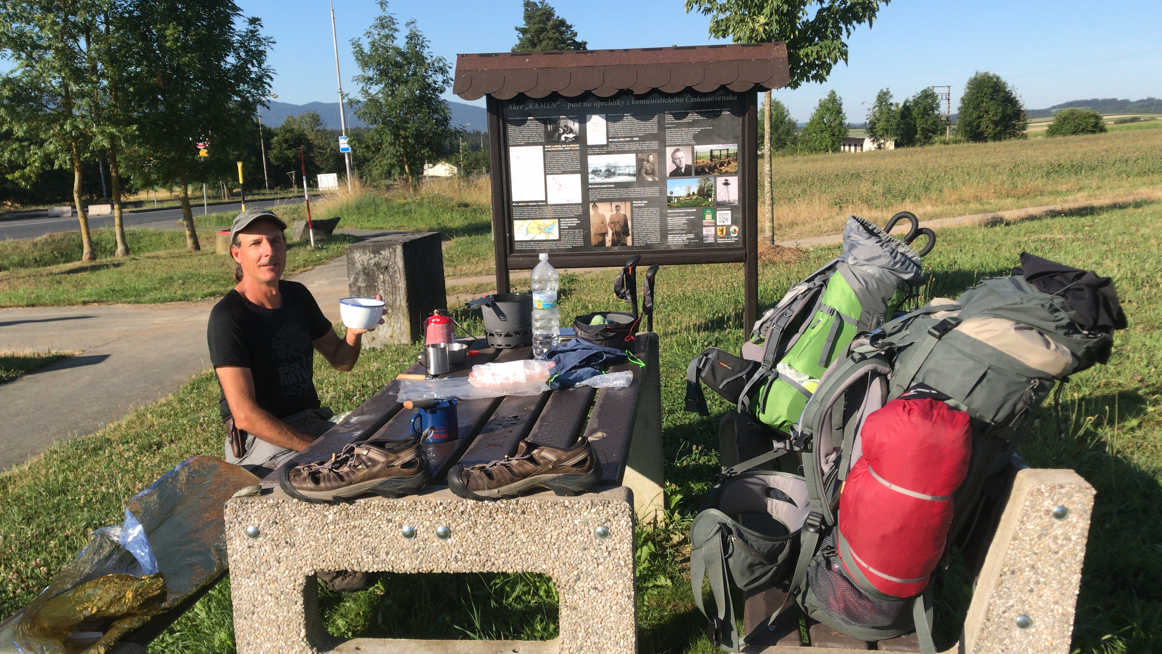 Odpočatí a dobře naladění jsme opět vyrazili na trasu. Naším dalším cílem je Nýrsko. Při posledním pohledu na jezero narážíme na pramen. S radostí si doplňujeme zásoby lahodné vody. Cesta se stává úžasnou. Lesní a luční cesty, roztomilé vesničky, krásná příroda. Na odpočívadle Lipová Hora potkáváme českou turistickou skupinu. Společně se občerstvujeme. Kvůli jazykové bariéře si nemůžeme pořádně popovídat. Přesto! Společný odpočinek je příjemný. Bohužel po odpočinku se cesty opět mění na šotolinové a asfaltové. Chůze se opět stává vyčerpávající. Rozhodujeme se proto opustit značenou trasu a odbočit na lesní cestu. Podle mapy nás vede stejným směrem a je dokonce zkratkou. Bohužel končí uprostřed lesa. Kam teď? Vrátit se zpět? Ne! Prodíráme se podrostem, zahlédneme telefonní linku, jdeme k ní a konečně nacházíme cestu zpět. Zkratka nás stála hodně sil. Je také teplý den. Potřebujeme si odpočinout na stinné louce. Je už pozdní odpoledne. Kde strávíme dnešní noc? Na mapě objevujeme rybník přímo na zeleném pásu u Všerub. Bingo! Cesta k němu nás vede nejprve kolem obrovské zemědělské farmy, pak podél hranic. Opět narážíme na pozůstatky minulosti: zříceniny, starou věž, vybledlé nápisy. Na dohled se objevuje rybník. Místo je to pěkné na pohled, ale terén je bohužel nerovný. Dnes je náš stan šikmo postavený. Při průzkumu objevujeme dvě informační tabule. Z první se dozvídáme, že zde kdysi stával mlýn, který v roce 1947 vyhořel. Druhá nám říká, že to bylo jedno z míst operace “Kámen – falešné hranice”. Pokud byste se chtěli o této perfidní hře komunistické tajné služby ČSSR dozvědět více, můžete se více dozvědět zde na stránkách CEBB. Doporučuji zejména knihu “Fingierte Grenzen – Aktion Kámen” od Válavy Jandečkové.