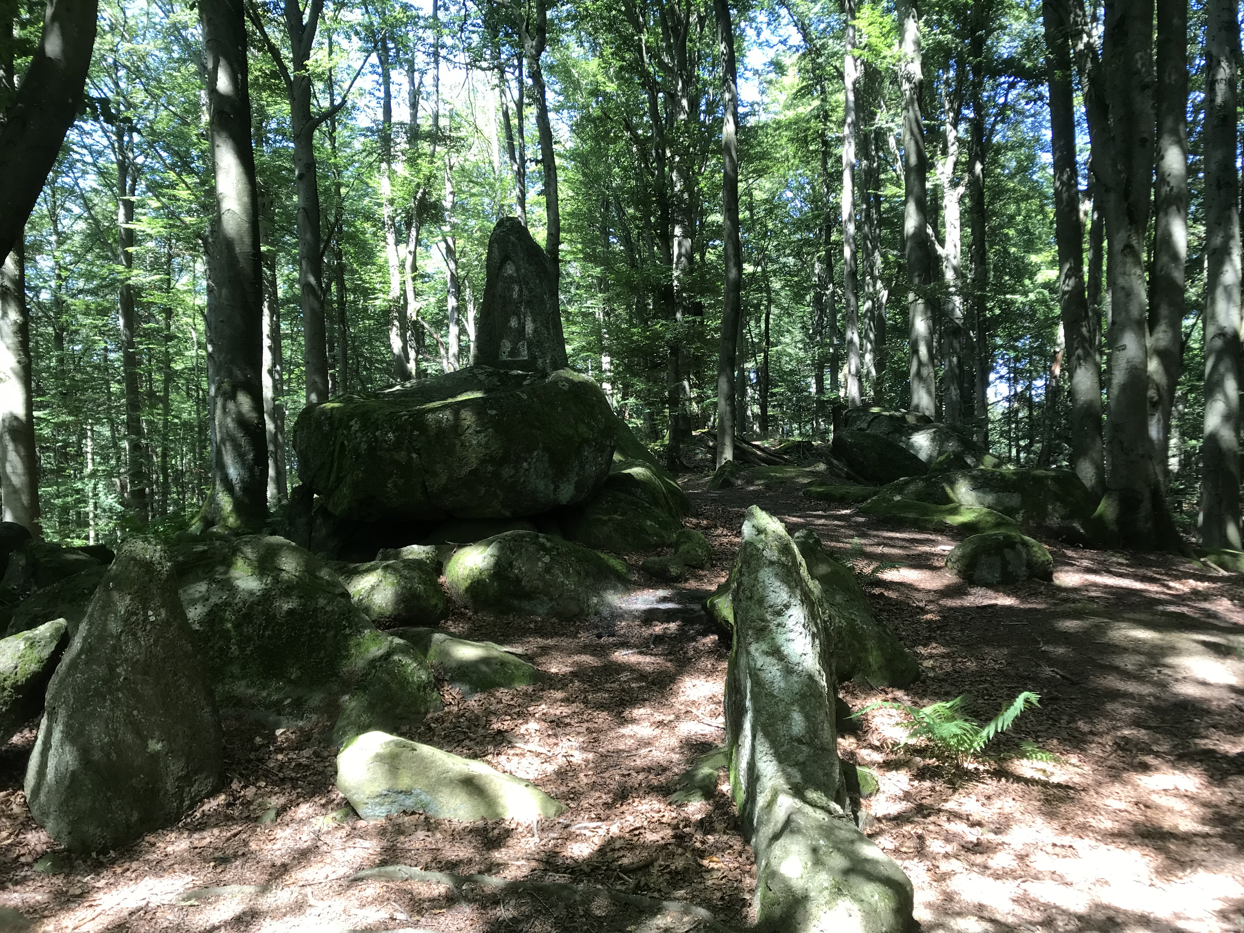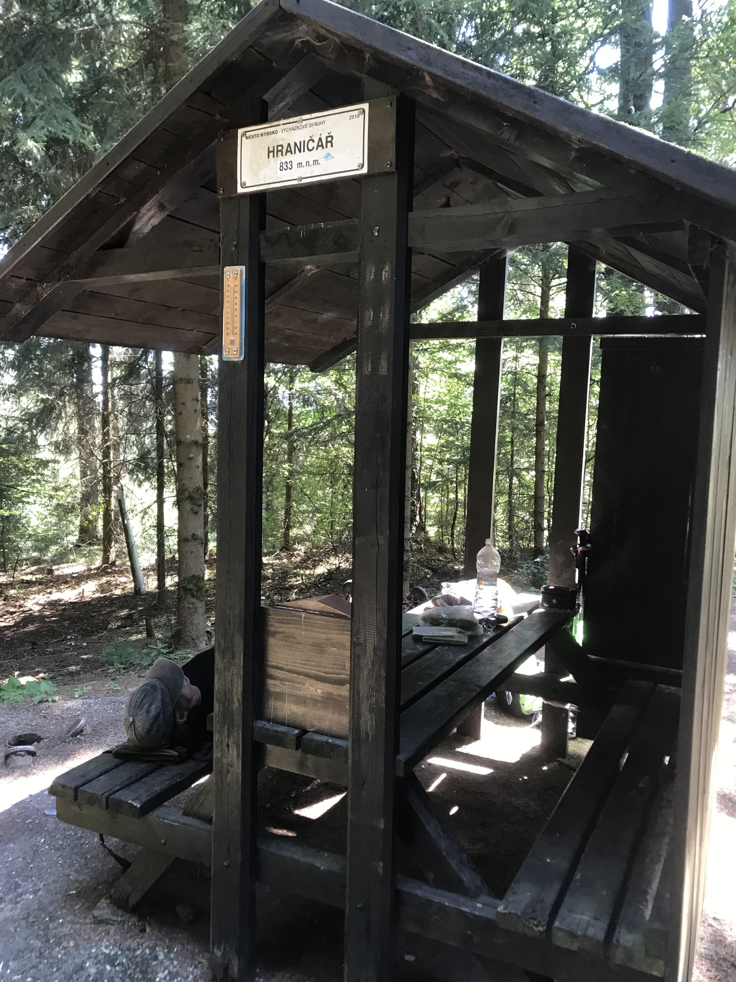 Noc byla špatná. Země byla nerovná. Vstáváme brzy. Balíme, bereme na ramena batohy a vyrážíme bez snídaně. Nemáme už skoro žádnou vodu a nutně potřebujeme doplnit zásoby. Hraniční přechod je blízko. Jakmile tam dorazíme, vidíme na obou stranách několik domů. Na české straně nemáme štěstí. Nikoho nevidíme. V Bavorsku je už v tuto časnou hodinu čilá selka na nohou. Srdečně nás vítá a klábosí s námi. To nejdůležitější! Kráčíme za vodou! Naše zásoby (8 litrů) jsou plné. Potřebujeme ji, dnes bude horký den. Snídaně s kaší na hraničním přechodu, jdeme dál. Jdeme po staré hlídkové cestě. Krajina je krásná, cesta je opět betonová. Namáhavé! Asi po devíti kilometrech se vydáváme na rozcestí lesních cest, překračujeme potok a pak špatně odbočujeme. Narážíme na “vesnici” Liščí. Neobyčejné místo. Na jedné straně je to zaniklé místo, zbyl jen statek. Na druhé straně poměrně velké území, připravené k zástavbě se dvěma autobusovými zastávkami, ale ani jedno staveniště, nemluvě o novostavbě. V horku se lopotíme po asfaltové cestě, odbočujeme na polní cestu a objevujeme směrovku “Zur Bären- Kapelle”. Pokračujeme do kopce do lesa. Vyčerpaní dorazíme na místo odpočinku, na Fuchsberg s kostelíkem. Po malém občerstvení se dozvídáme, že kaple je zasvěcena svatému Bernardovi. Podle místní legendy byl na tomto místě v roce 1719 napaden medvědem Georg Kohlbeck z Liščí. Ten boj přežil a na poděkování nechal postavit kapli. Jen několik kroků odtud se nachází neobvyklý skalní útvar připomínající chrám. V jeho středu stojí dva menhiry. Údajně se jedná o místo se silnou zemskou energií. To je pro nás dobré. Dnes ji obzvlášť potřebujeme. Poté, co vyjdeme z lesa po cestě, která byla příšerně poničena lesní technikou, nás zasáhne dusné červencové vedro. Naše voda je téměř spotřebovaná. Po necelých dvou kilometrech dorážíme do vesnice Chudenín. Vítá nás malý, kouzelný statek, který si okamžitě zamilujeme. Na zahradě vidíme rodinu, která vidí nás. Ritschi mává prázdnou lahví. Přibíhá mladá žena, bere naši láhev, jde s ní do domu a vrací se s plnou a dvěma zmrzlinami. Tak milé! Jaké to lahodné osvěžení. Poděkujeme jí a procházíme vesnicí s mnoha zchátralými staveními.