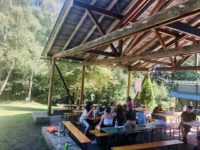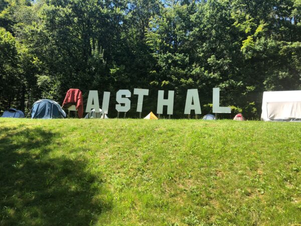 Ptáme se na historii a letošní ročník tábora. Vedoucí nám vyprávějí o tom, že sami na tábor jezdili jako děti, že v okolí působí řada blízkých duší, které pomáhají nebo dodávají dobré věci k jídlu. Děti se vždy velmi rychle přihlásí na české straně, na německé straně je to trochu pomalejší. Pro česko-německé rodiny je tábor možností, jak nechat dětem zažít samozřejmou blízkost sousedů, kousek od hranice. Děti se na tábor rády vrací, většinou žijí ve větších městech, je to pro ně zážitek jiného světa. Tábor má každoroční téma, které se zpracovává po dobu čtrnácti dnů v promyšleném programu. Téma a program připravují vedoucí tábora, kteří studují na německých a českých vysokých školách. Program a každoroční téma zaměstnávají táborníky natolik, že téměř nepotřebují okolí. Téma umělé inteligence je letos spojeno i tématem ochrany osobních dat. Když jsme se po příchodu do tábora jednoho chlapce zeptali, kolik je tu dětí, odpověděl nám, že se to neříká, protože jde o důvěrná data. Možná to myslel žertem, možná byla jeho odpověď znamením, že ho téma tábora zcela pohltilo. S tématem tábora nás to seznámilo hned u vchodu.