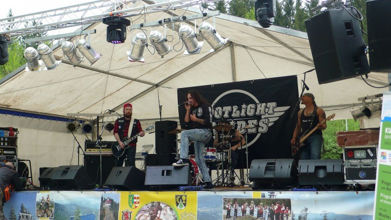 Festival na scéně na bavorské straně zahájila hudební skupina \”Soundcheck\” z Plzně, která již měla příležitost sbírat zkušenosti s česko-německými hudebními projekty. Následně přivítali starosta Georg Bauer (Bavorská Železná Ruda) a Michal Šnebergr (Železná Ruda) společně se spolupracovníky CeBB Sebastianem Lesňákem a Maikou Victor-Ustohal hudební fanoušky z obou zemí. Poté jsme na české scéně pokračovali s \”poctivým\” rock\’n\’rollem hudební skupiny \”Spotlight Brides\” z Zwieselu, která se před týdnem v Mnichově probojovala do finále soutěže Emergenza Bandcontest a hrdě mohla prezentovat své nové album. Po nich následovali \”Nixon Lads\” ze Strakonic v jižních Čechách se směsicí indie, popu a punku a skupina \”Shorelines\” z Horní Falce s tvrdšími metalovými tóny. Při vystoupení indie rockové hudební skupiny \”Groovetown\” z Karlovarského kraje se pomalu začalo stmívat, umělé osvětlení a mlha vytvořily skutečnou festivalovou atmosféru. Velice bujaře poté publikum na závěr tančilo při show skupiny \”Garage Inc.\” z Horních Frank.