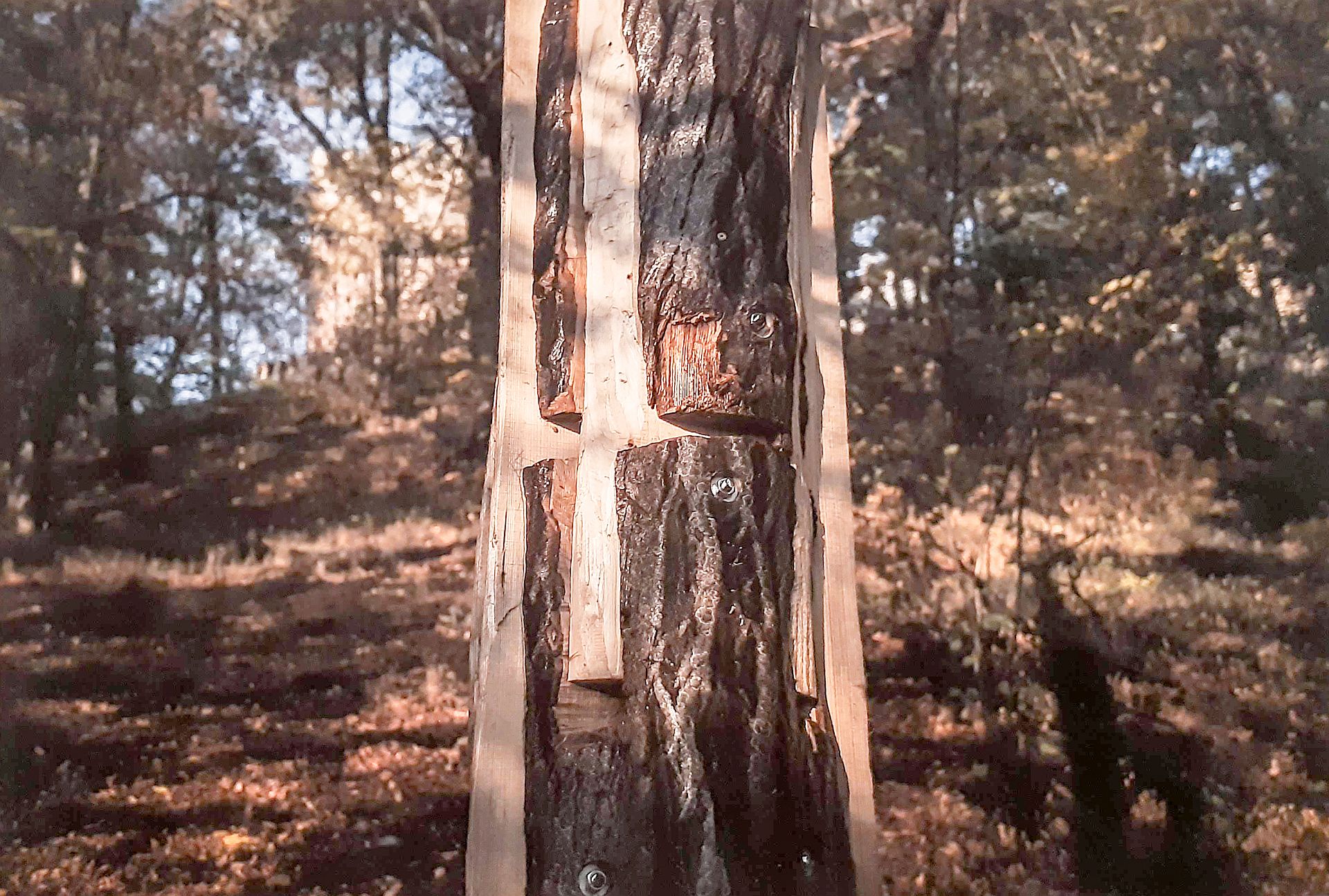 „Instalaci tvoří dva prefabrikované ocelové stožáry, z nichž jeden zaujímá sobě vlastní vztyčenou pozici a druhý leží padlý opodál. Prvotním impulsem k vytvoření této kompozice byla autorčina vzpomínka na český les a volně ležící smrkové klády natřené sytě růžovým insekticidním roztokem. V přímém kontrastu se zde nacházel stále živý, zelený lesní porost a již mrtvá torza stromů napadaná kůrovcem.“