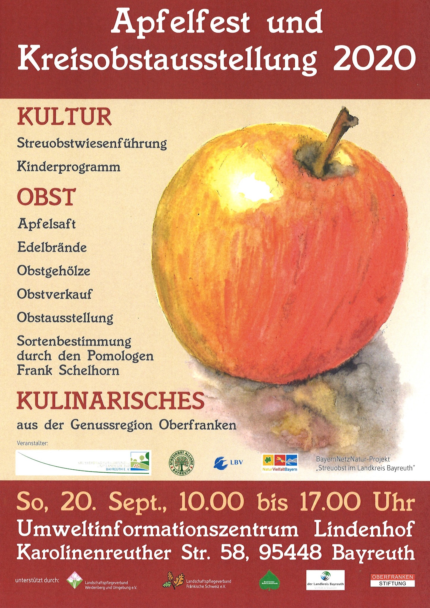Neben Obst und Obstprodukten gibt es u.a. Streuobstwiesenführungen, ein Kinder-programm, Wissenswertes rund um Streuobstwiesen und Kulinarisches aus der Genussregion Oberfranken.