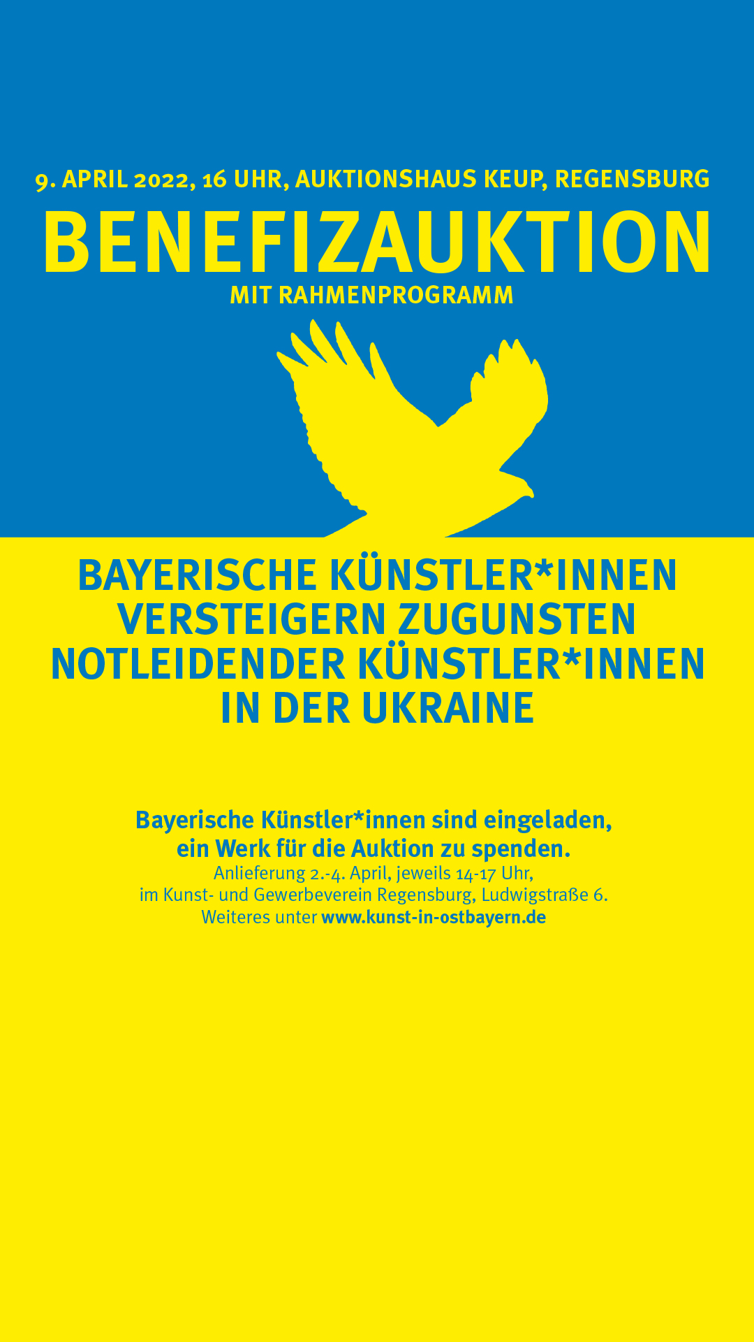 Der Krieg in der Ukraine schreitet fort und kein Ende in Sicht. Viele Vereine und Organisationen machen sich Gedanken, wie man helfen kann, um die notleidende Bevölkerung zu unterstützen, so auch der BBK Niederbayern/Oberpfalz e.V. Der Verband organisiert hierzu eine Benefizversteigerung mit Rahmenprogramm im Auktionshaus Keup in Regensburg. Bayerische Künstlerinnen und Künstler wurden durch den BBK Niederbayern/Oberpfalz e.V. aufgerufen, ein Werk zu spenden, um daraus die Auktion zu gestalten.
