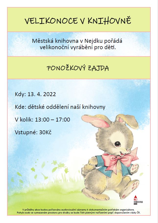 Sockenhase – Osterworkshop für Kinder In der Kunstwerkstatt kann man einen Hasen aus Socken basteln.Veranstaltungsortnáměstí Karla IV. 239, 362 21 NejdekKarlsbader Bezirk, TschechienTermin 13.04.2022 13:00 - 17:00 Preiseca. 1,00 €Veranstalter Městská knihovna NejdekKarte náměstí Karla IV. 239, 362 21 Nejdek, Tschechien » Routenplanung öffnen