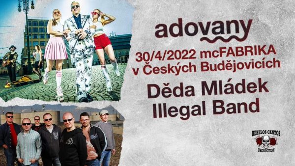 Die Band Adovany ist eine chaotische und groovige Punk-Soul-Laser-Band, die originelle Musik im Stil von Rock, Pop, Funky und Indie spielt. Sie traten zum Beispiel als Vorgruppe der Band Chinaski auf und werden nicht nur dank ihres typischen und exzentrischen Images beim Publikum schnell beliebt. In Kombination mit der Děda Mládek Illegal Band wird dies ein Konzert voller Energie und Humor sein! Die Gruppe DMIB adaptiert seit zwei Jahrzehnten auf besondere Weise die fast vermenschlichten Lieder von Ivan Mládek.