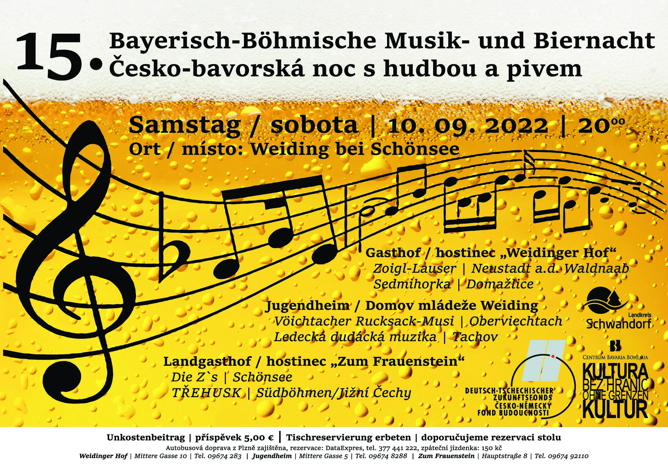Am zweiten Samstag im September – 10.09.2022 – steigt an drei Locations in der Gemeinde Weiding die inzwischen 15. Bayerisch-Böhmische Musik- und Biernacht. Das Centrum Bavaria Bohemia setzt dank der Unterstützung des Deutsch-Tschechischen Zukunftsfonds im Projekt „Kultur ohne Grenzen – Begegnungen Bayern-Böhmen“ die Tradition fort und bringt auch heuer Bayern und Böhmen am Wirtshaustisch zusammen, um mit Freunden einen kurzweiligen Abend zu verbringen.