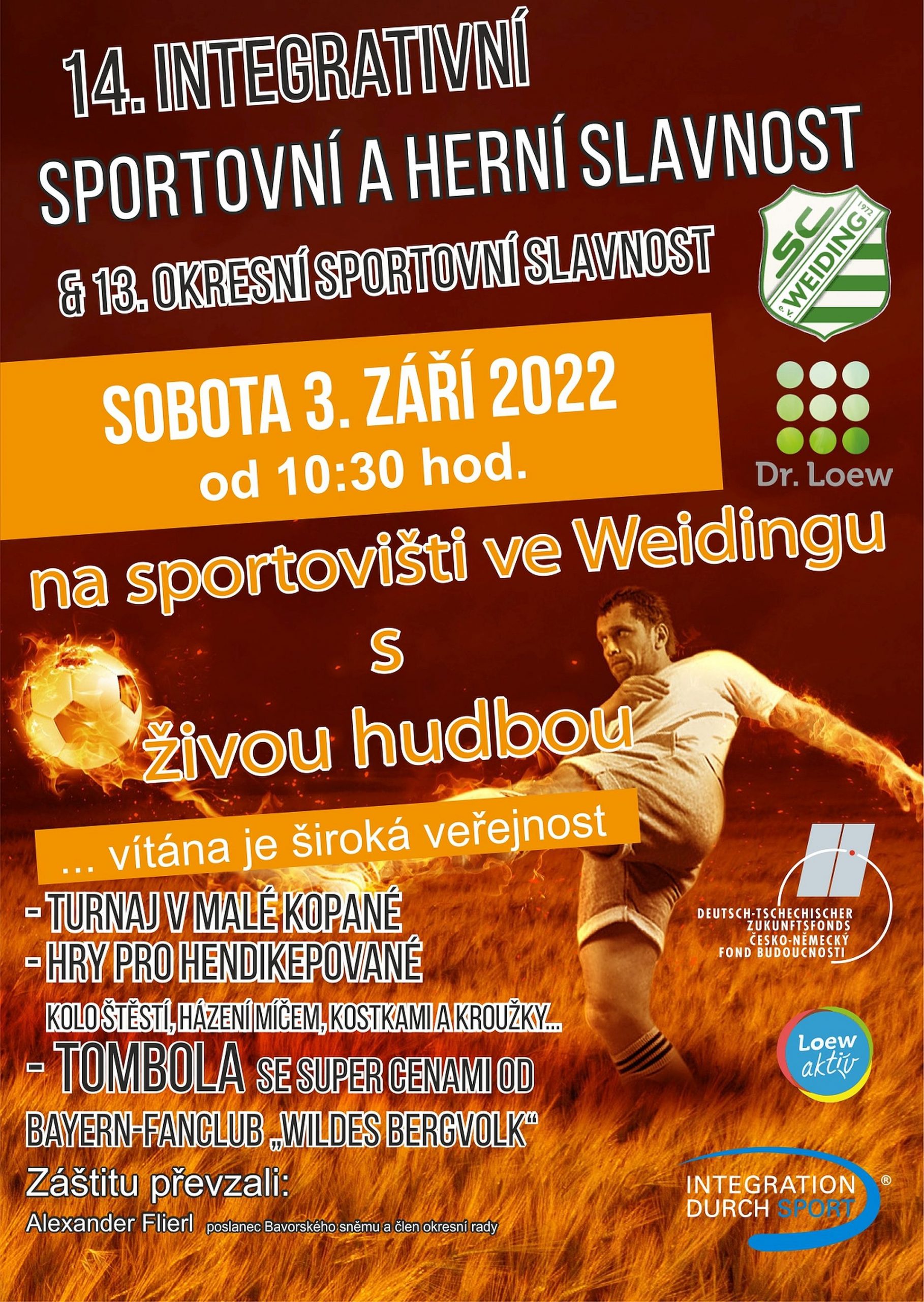 Es handelt sich um ein Fußball-Turnier mit Mannschaften aus Deutschland und Tschechien. Weiter ist ein Spieleparcours mit ca. 10 behindertengerechten Stationen aufgebaut. Mitmachen können hier sowohl körperlich, als auch geistig gehandicapte Teilnehmer.