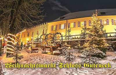 Das Areal rund um Schloss Guteneck verwandelt sich wieder zu einem Wintermärchen und wird dieses Jahr durch Lichtkünstler der Hochschule Coburg mit energiesparender Technik illuminiert. So können wir Ihnen trotz der angespannten Energiesituation eine wie gewohnt ganz besondere Atmosphäre bieten. Alle Jahre wieder sind auch das Christkind, Weihnachtsengel und der Weihnachtsmann anwesend, nebst Streichelzoo, der lebensgroße Krippe und vielen weihnachtlichen kulinarischen Schmankerln.