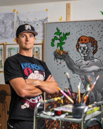 Das ursprüngliche Mitglied des Enfant terrible der tschechischen Graffiti-CAP-Crew, Jakub Matuška, ist heute einer der erfolgreichsten Künstler seiner Generation und konzentriert sich hauptsächlich auf die Malerei. In den Vierzigern erreichte er den Höhepunkt seiner Experimente, seinen souveränen Zeichenstil auf große Leinwände zu übertragen, wobei er oft komplizierte Techniken mit Photoshop und monatelanger Handarbeit mit Acrylfarben einsetzte. Sein Hintergrund in der Straßenkunst führte ihn vor Jahren zu Sprühfarbe und Airbrush, dem primären Medium, mit dem sich die zeitgenössische postanaloge Malerei mit Fragen der Flächigkeit und Tiefe, des Festen und Flüssigen, des Gesicherten und Ungewissen auseinandersetzt.