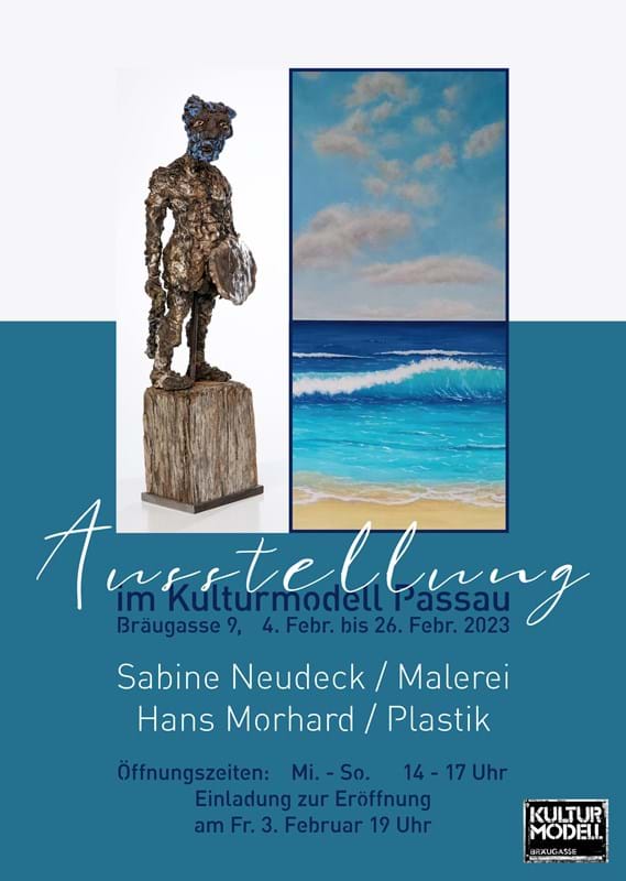 Als ergänzenden Kontrast dazu stellt Hans Morhard aus. Morhard: „Wie bei keinem anderen Material kann ich hier der Materie Leben einhauchen. Aus einem Klumpen Ton entstehen witzig-skurrile Figuren, die vorher nicht geplant sind. Dabei beginnt der Entstehungsprozess meist mit dem sehr schnellen Formen eines Kopfes und der Frage: Was bist denn du für einer? Sehe ich nichts, was mir gefällt oder ist es zu glatt, schon zu weit entwickelt, der Realität zu nahe, wird der Kopf malträtiert, etwas weggeschnitten und an den unmöglichsten Stellen wieder angefügt. Aus einem Kuhkopf wird plötzlich ein Löwe, aus der Frau ein Mann (und meistens wird es ein Mann …) oder wieder ein Klumpen Ton.“ Intuitiv entstehen so seine Plastiken, die dann meist ihren letzten Schliff durch die Anordnung auf einem mit der Motorsäge herausgeschnittenen Sockel oder Rahmen erhalten.