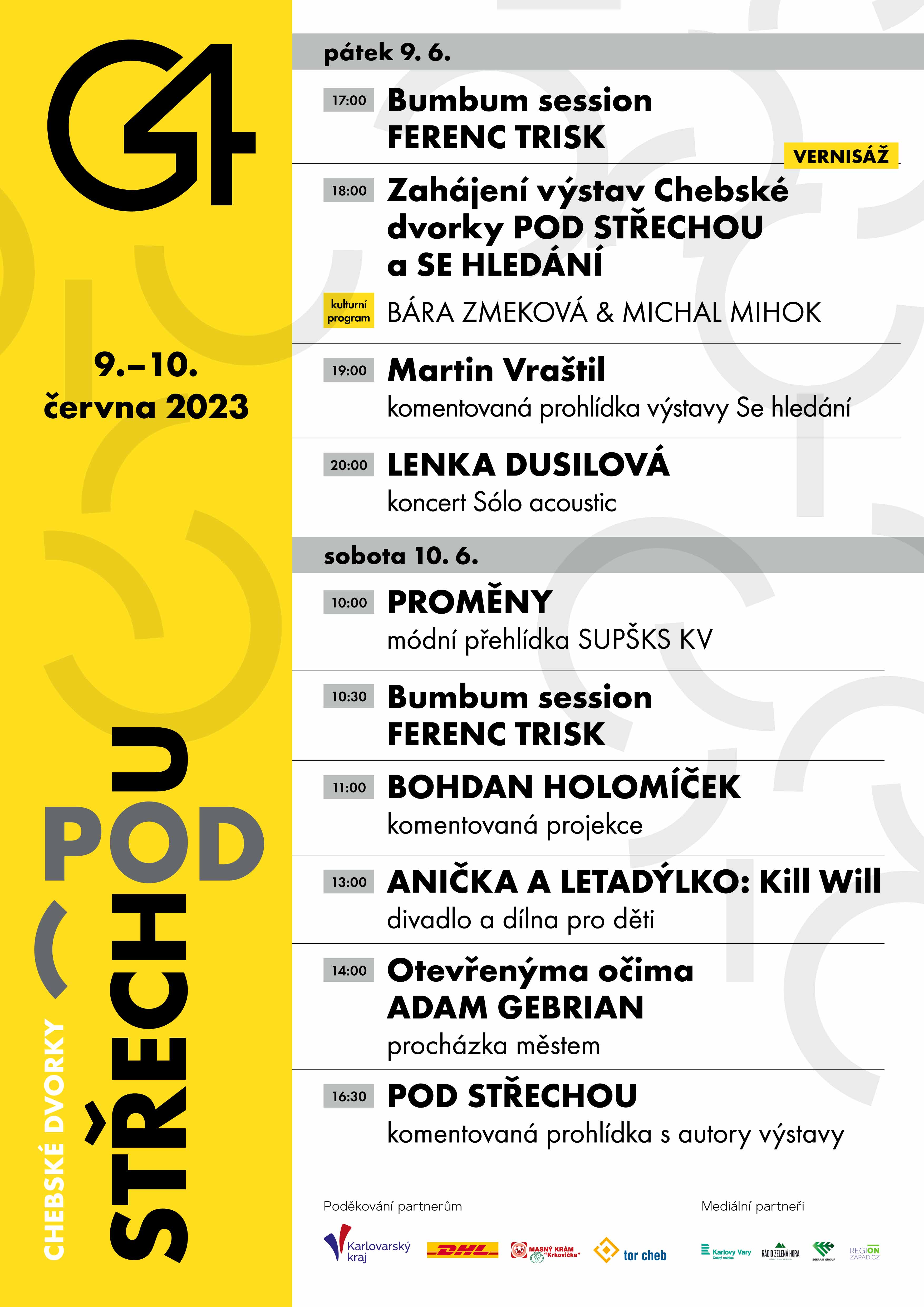 Am Freitag findet die Eröffnung der Ausstellung von Fotografien, Gemälden und Objekten von Autoren statt, die in den letzten 20 Jahren an der Open-Air-Show Egerer Höfe teilgenommen haben. Kurz vor der Eröffnung der Ausstellungen wird František Tříska seine Trommelkünste demonstrieren, während der Eröffnung erklingen neue musikalische Werke von Bára Zmeková. Der Fotograf Martin Vraštil wird seine Arbeiten bei einer Autorenausstellung im G4 Club präsentieren. Das Akustikkonzert von Lenka Dusilová beginnt um 20:00 Uhr.