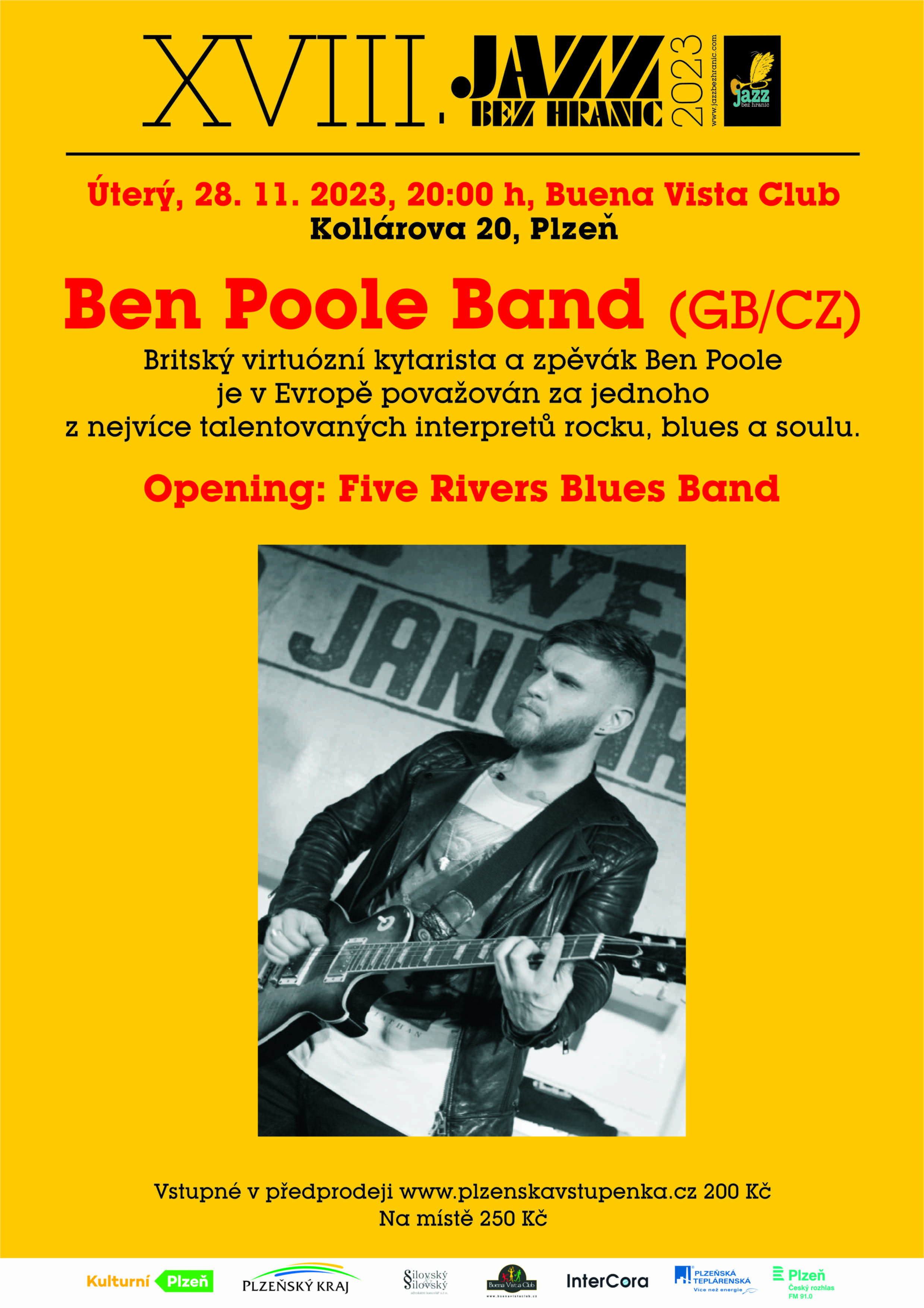 Der britische Gitarrenvirtuose und Sänger Ben Poole gilt als einer der talentiertesten Interpreten von Rock, Blues und Soul, der in den letzten Jahren in Europa aufgetaucht ist und sogar mit der Zukunft der europäischen Blues-Rock-Szene in Verbindung gebracht wird. In seinen Songs mischt er Blues mit Elementen aus Rock, Pop, Soul und Funk. Ben Poole wurde von den renommierten Magazinen TotalGuitar und MusicRadar als bester Blues-Rock-Gitarrist der Jahre 2017 und 2019 nominiert. Auf seiner (wegen der Covid) verschobenen Tschechien-Tournee wird er von Tomáš Lacina am Bass und Roman Vícha am Schlagzeug begleitet. Eröffnet wird der Abend von der Five Rivers Blues Band.