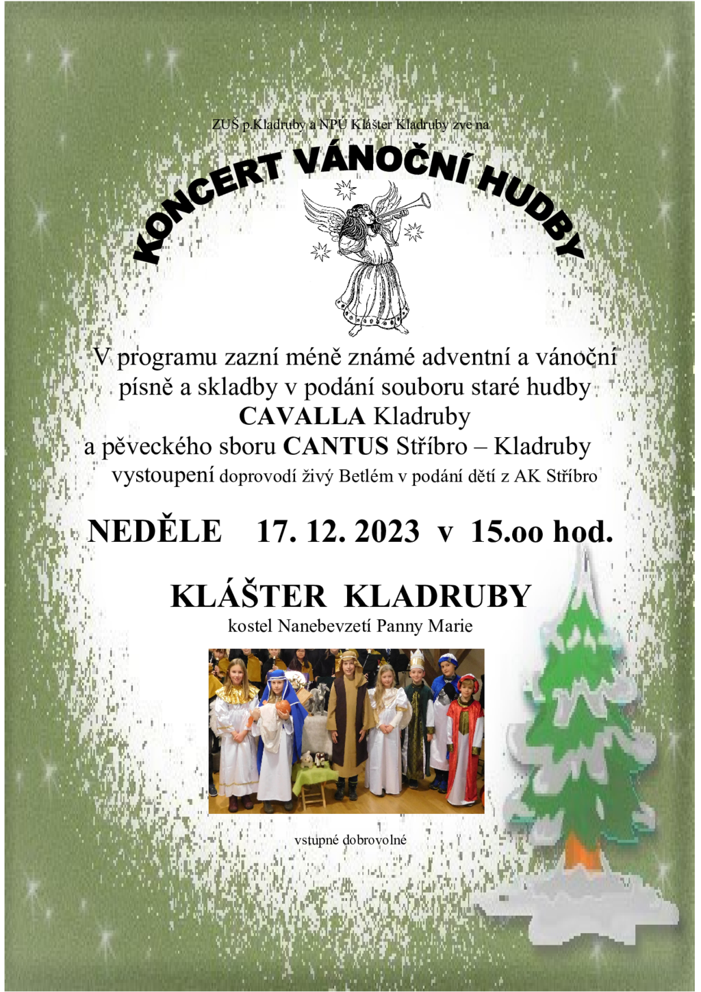 Das Ensemble für Alte Musik Cavalla und der Cantus-Chor spielen und singen weniger bekannte Weihnachtslieder aus Barockkantaten. Begleitet wird die Aufführung von einem Live-Krippenspiel von Kindern des AK Stříbro. Das Konzert findet in der Kirche Mariä Himmelfahrt im Kloster Kladruby statt.