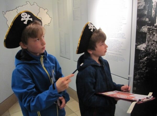 „Bewaffnet“ mit Piraten-Kopftuch, Rätselbogen, Schreibunterlage, Lineal und Bleistift begeben sich die Kinder auf die Suche nach dem legendären Schatz, den angeblich Piraten im Museum versteckt haben.